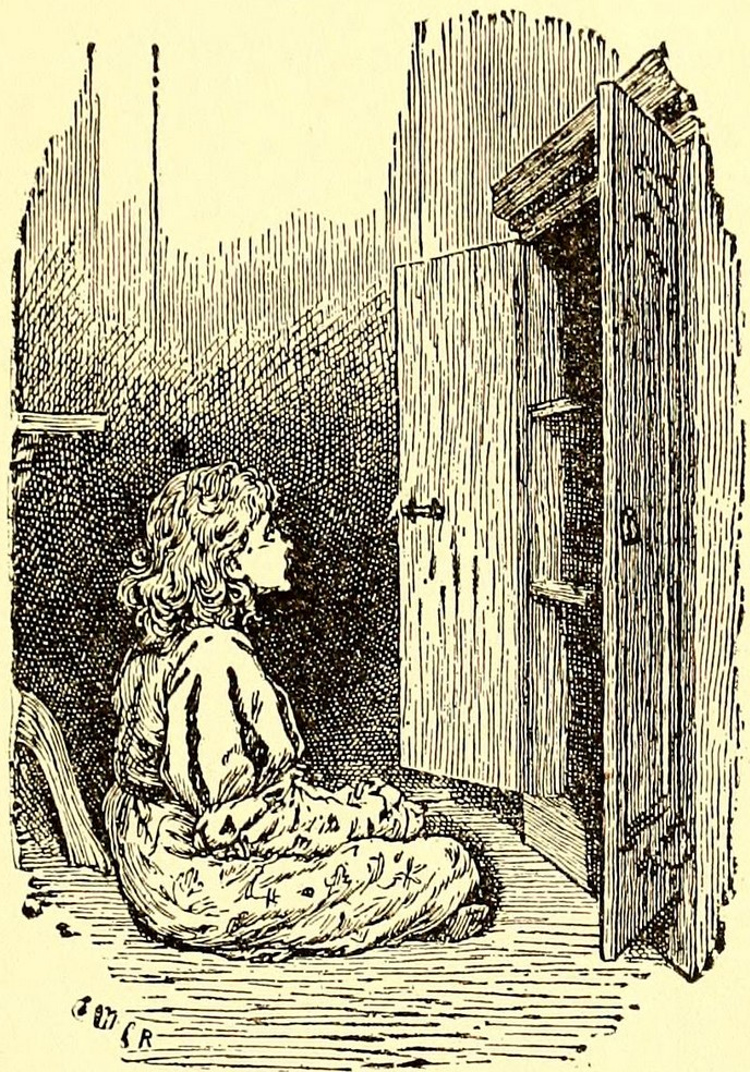 This image is taken from chapter five of the text The Little Lame Prince by Miss Mulock (Pseudonym of Maria Dinah Craik). In this photo the prince is sitting down on the floor looking at “the empty shelves, so beautifully clean and tidy.” This image connects to the idea of loneliness and sadness especially after the narrator describes the prince “bursting out sobbing as if his heart would break” after looking at the empty shelves. |
