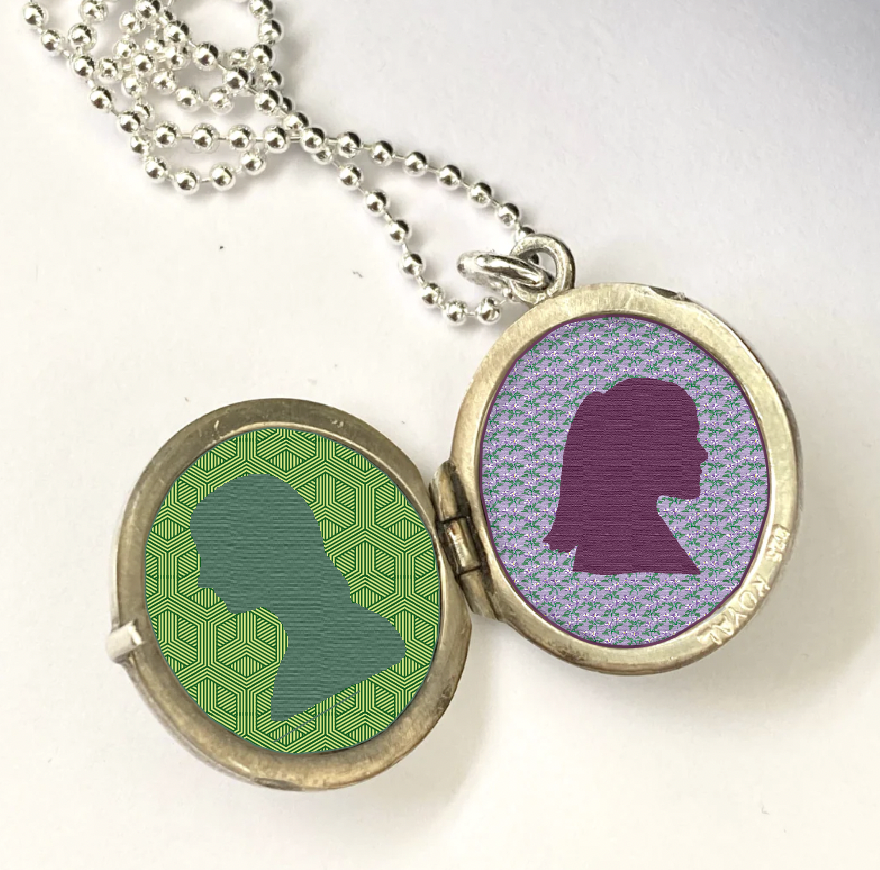 Portrait Miniatures of Donna and Amanda Blanco for Antique Locket, Crafted by Josephine Blanco, 2023. This is an image of my final product. I chose the locket because my grandmother wore a locket for most of her life. It held two images , one of her mother and one of her father. It was a gift from her mother when she moved to America at 19, so she had images to remember her family by. Lockets have a long history dating back to the 16th century. Originally, lockets held pieces of fabric, hair, or perfume soaked cloth to ward off bad smells. The locket was popularized by Queen Elizabeth in the 17th century when she sent out ring lockets of her portrait to those close to her. Nowadays, the locket is used mostly to hold photographs, but that has varied throughout the years. For example, in the Regency era it was most common to hold someone's hair in either a necklace or ring locket. We see this in Sense and Sensibility in the hair ring that Edward Ferrars wears. My project is a modern take on the locket; it is filled with digital illustrations of my sister and mother instead of photographs or hand made prints.