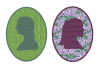 Complete Portrait Diptych of Donna and Amanda Blanco, Crafted by Josephine Blanco, 2023. This image is a diptych of the final portrait miniatures of my mom and sister. I used Illustrator to personalize both portraits. For my mother's portrait, I chose the color green because it is her favorite color. I chose the background because it reminds me of Celtic knot patterns that my mom has around the house. The one of my sister uses the color purple because it is her favorite color. I chose to use a darker purple over a light background, so the silhouette stands out. For the background I selected a flower pattern because my sister always has fresh cut flowers in her room.