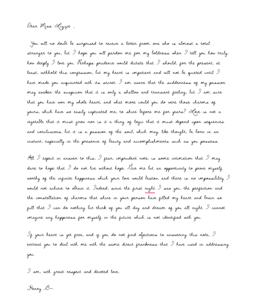 Character Commentary: This is a letter I received from a young man who happens to be now my lovely husband. I met Henry at a wedding years ago to celebrate his brother's marriage to one of my good friends, Charlotte. Henry approached me late that night after a couple of drinks and we had a nice long chat late into the night. I was wearing my favorite lilac dress. We talked for hours about the purpose of life, our shared love for poetry, and my family. He was such a gentleman. We eventually talked about Laura’s unfortunate circumstances that had taken place earlier that year. I really opened up to him about how that had been an extremely tough time for both Laura and me. It was surprising how he listened and related to similar difficulties with his brother. It was a refreshing conversation that replayed in my head for days. That's why I was so relieved when I received this letter from him just a couple of weeks later. Henry was very good with his words, which is partially why this letter swept me off my feet. I especially noticed when he wrote about the vegetables which was definitely a hint of what we talked about that night of the wedding in regards to the Goblin Market. That part especially meant so much to me cause I knew he was listening, and finding a man who listens is almost impossible these days. After I re-read this letter almost a million times and showed all of my friends, I wrote him back. We were married 8 months later. It was honestly love at first sight.