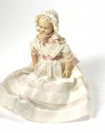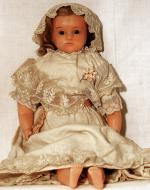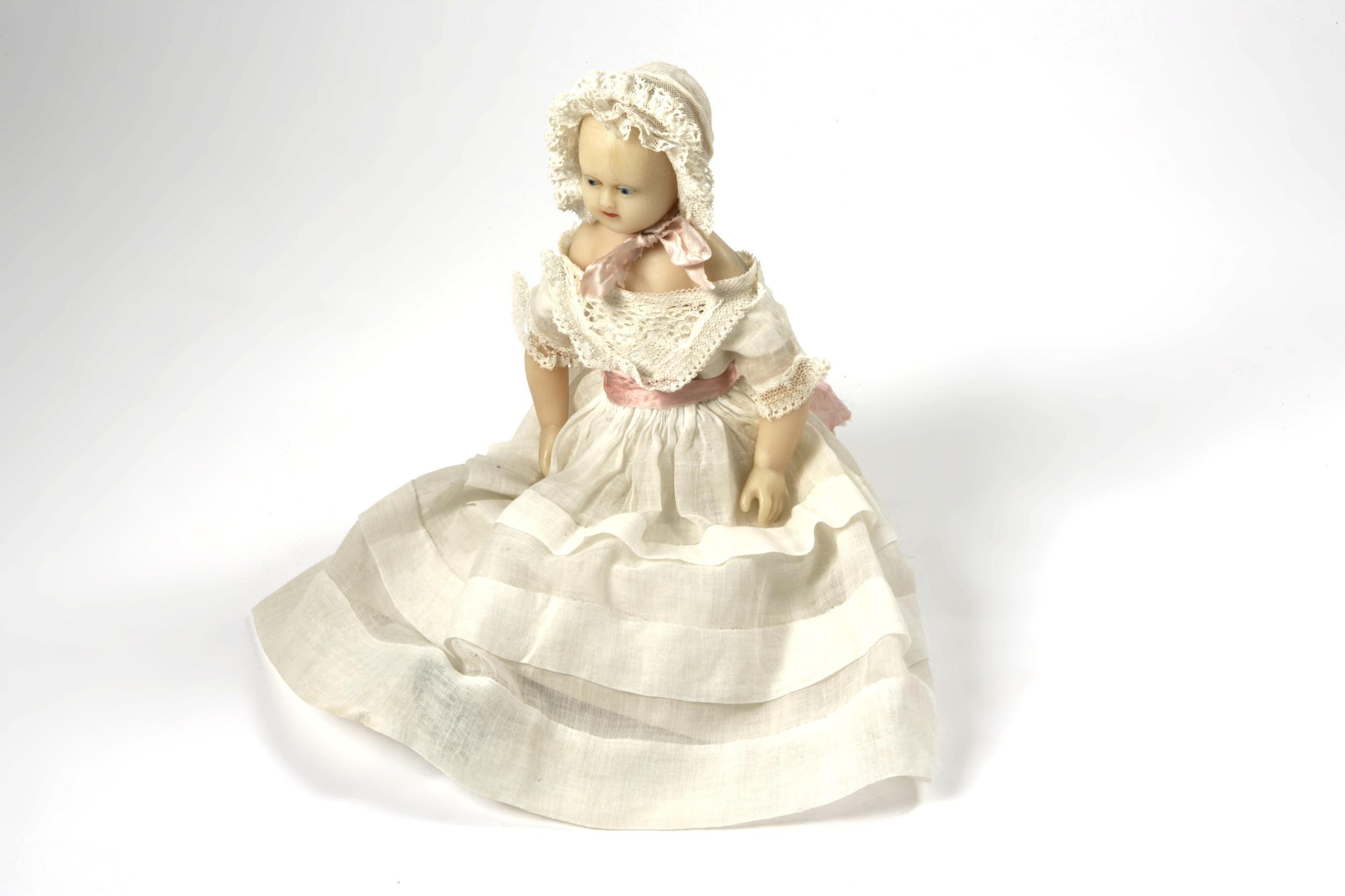 Wax dolls were one of the most famous and expensive luxury dolls in Victorian-era England. A testament to their price and extravagance, the process of manufacturing wax dolls was a complex multi-step process. Their heads were first constructed of wax shells, which were then put together and reinforced with a hard paste. They were then dusted with powders such as potato meal and alabaster, which gave it a fleshlike appearance. Facial features such as eyes, eyelashes, and hair were then added by separate workmen. The sum of these efforts created dolls that were considered the most realistic compared to dolls made of other materials such as porcelain, papier-mache, and wood. In their completed form, wax dolls often resembled young ladies. They were dressed in lavish garments made of velvet and silk and came to amass miniature trousseaus, one such collection amounting to more than 150 clothes, furniture, and other accessories.