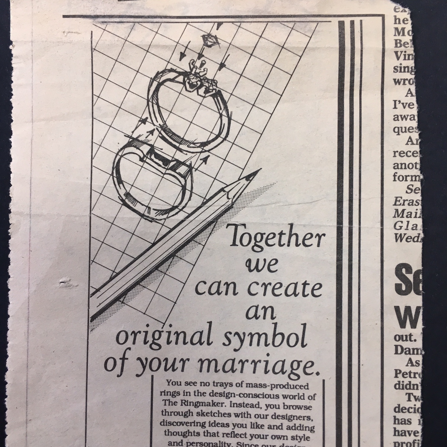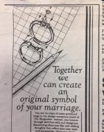 As I was sitting in my living room reading the paper, this ad for engagement rings stood out. Throughout my life, I have disapproved of society's expectations for men to buy engagement rings for women. I believe that a ring symbolizes expectation and wealth rather than love. This page struck an unexpected anger in me, and I believe it’s because I feel that a ring has no meaning besides bondage. A marriage united with love is wonderful, but engagement rings seem to represent money and finances rather than love. The ring itself is supposed to be exciting and glorious, but really it is just a…