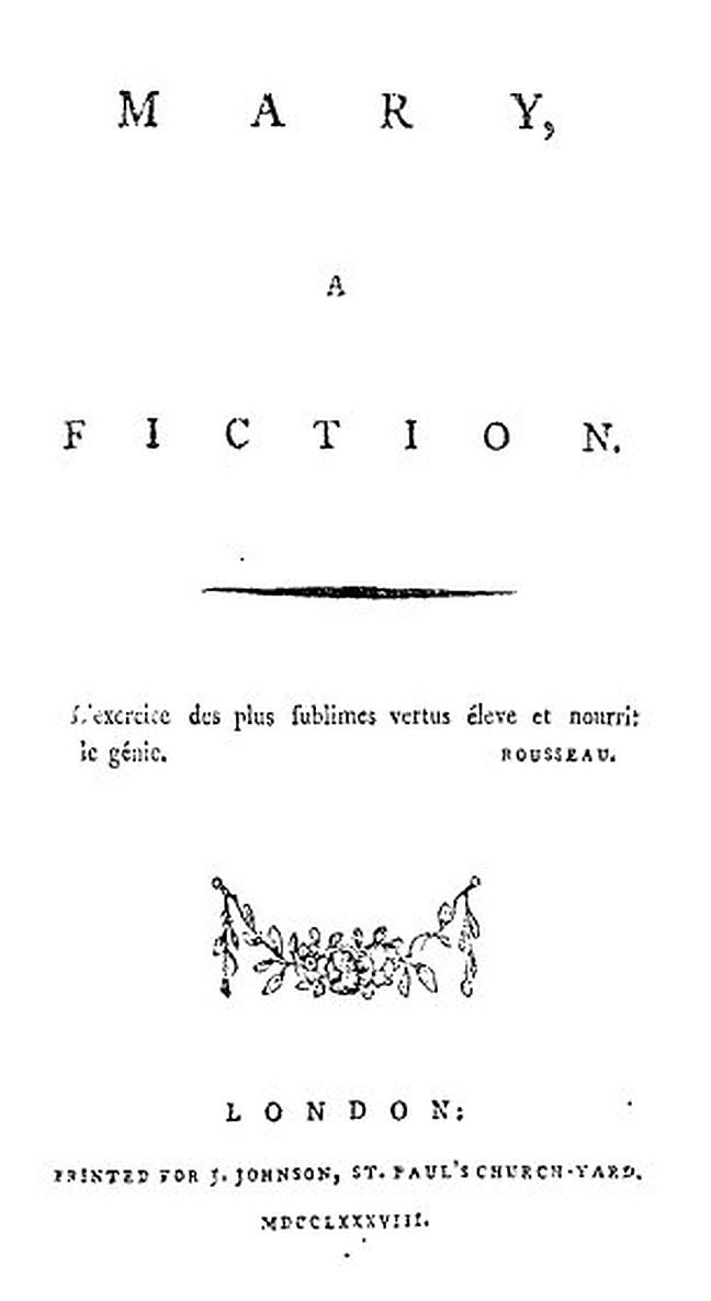 Mary: A Fiction is a novel published in 1788 after Mary had spent a year as a governess to an Irish family and officially decided to become an author by trade. Much of this novel stems from her own life as the main character, Mary (subsequently named after her), lost her best friend as well, among other things. Wollstonecraft not only made strides with this story by making the main character a woman confident in her sexuality, but also she was able to critique the current time's view on women and marriage, as the character Mary was labeled a genius.