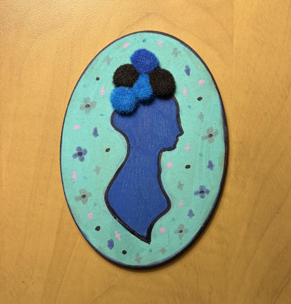 Crafting Process of Jane Austen's Silhouette, Photograph by Catherine J. Golden, 2025. I chose a medium-sized wooden oval for my silhouette. I wanted to draw directly on the wood rather than attach a paper cut-out to it. I find coloring fun and relaxing, so I was excited to pick out some cool colors for the background and the silhouette itself. I went with shades of blue since the color reminded me of the Regency era. I found a photo of an artist's Jane Austen silhouette and used it as a reference to draw a silhouette on the wood in blue marker. I chose a shade of teal blue to color around the silhouette. I wanted the silhouette to stand out from the background, so I colored the shape in with a darker shade of blue. Then, I outlined the silhouette again in black marker to define the lines. I decided to give Jane a fancy hat that a wealthy young lady like Emma Woodhouse might wear. I glued pom-poms into a hat-like shape, traced the outline of the wooden oval with black marker, and added some small flowers and colorful dots to the background. I tried gluing feathers to the sides of the wood, but the hot glue gun was not working in my favor.