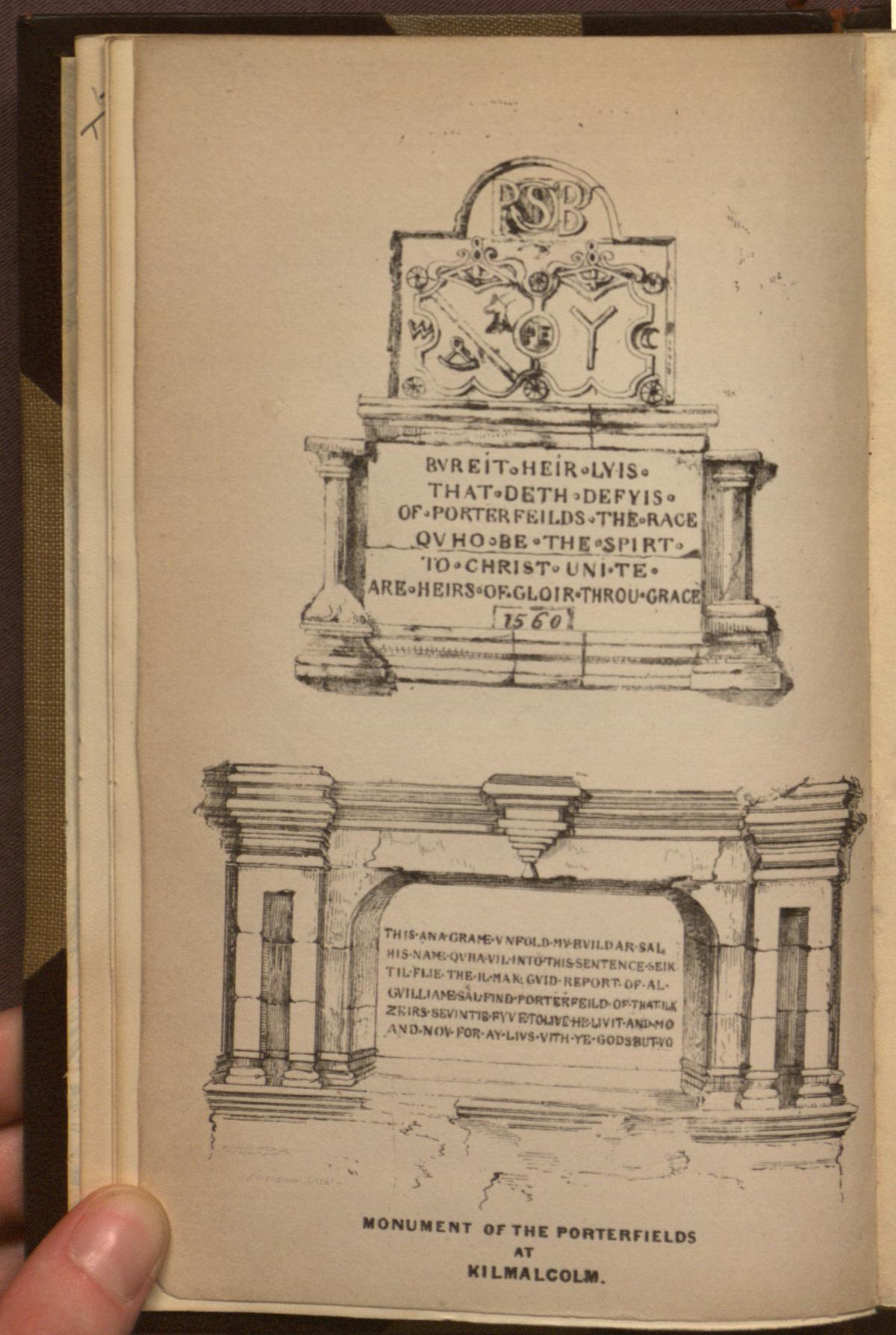 The image depicts a momument, inscribed with an epitaph, in two parts: the topmost figure appears to be the top of a momument, while the figure below it may be the base. The upper part is decorated with the initials "PSB," as well as with symbols reminiscent or perhaps representative of a coat of arms. Beneath this decoration are six lines of engraved writing: "BVREIT HEIR LVIS/ THAT DETH DEFYIS/ OF PORTER FIELDS THE RACE/ QV HO BE THE SPIRT/ TO CHRIST UNI TE/ ARE HEIRS OF GLOIR THROUGH GRACE/ 1560." The bottom part of the momument is also engraved with six lines of writing: "THIS ANA GRAME VNFOLD MV BVILDAR SAL/ HIS NAME QVHA VIL INTO THIS SENTENCE SEIK/ TIL FLIE THE IL MAK GVID REPORT OF AL/ GVILLIAM SAL FIND PORTERFEILD OF THAT ILK/ ZEIRS SEVINTI? FYV ETOLIVE HE LIVIT AND MO/ AND NOV FOR AY LIVS VITH YE GODSBUTVO."3The image depicts a momument, inscribed with an epitaph, in two parts: the topmost figure appears to be the top of a momument, while the figure below it may be the base. The upper part is decorated with the initials "PSB," as well as with symbols reminiscent or perhaps representative of a coat of arms. Beneath this decoration are six lines of engraved writing: "BVREIT HEIR LVIS/ THAT DETH DEFYIS/ OF PORTER FIELDS THE RACE/ QV HO BE THE SPIRT/ TO CHRIST UNI TE/ ARE HEIRS OF GLOIR THROUGH GRACE/ 1560." The bottom part of the momument is also engraved with six lines of writing: "THIS ANA GRAME VNFOLD MV BVILDAR SAL/ HIS NAME QVHA VIL INTO THIS SENTENCE SEIK/ TIL FLIE THE IL MAK GVID REPORT OF AL/ GVILLIAM SAL FIND PORTERFEILD OF THAT ILK/ ZEIRS SEVINTI? FYV ETOLIVE HE LIVIT AND MO/ AND NOV FOR AY LIVS VITH YE GODSBUTVO."