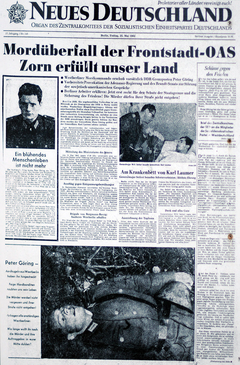 This source covers the event of the murder of Peter Goring. On May 23, 1962, an East Berlin soldier (Peter Goring) was murdered as a young fourteen-year-old boy made an escape attempt to cross into West Berlin. The young boy that attempted the escape was caught leading to a shootout between the Eastern guards and Western police forces. This boy escaped with major injuries, but with the conflict that arose, Peter Goring was killed. Although this was on the East’s side of the wall, they portrayed Goring as a hero that had been assassinated by those of the West.