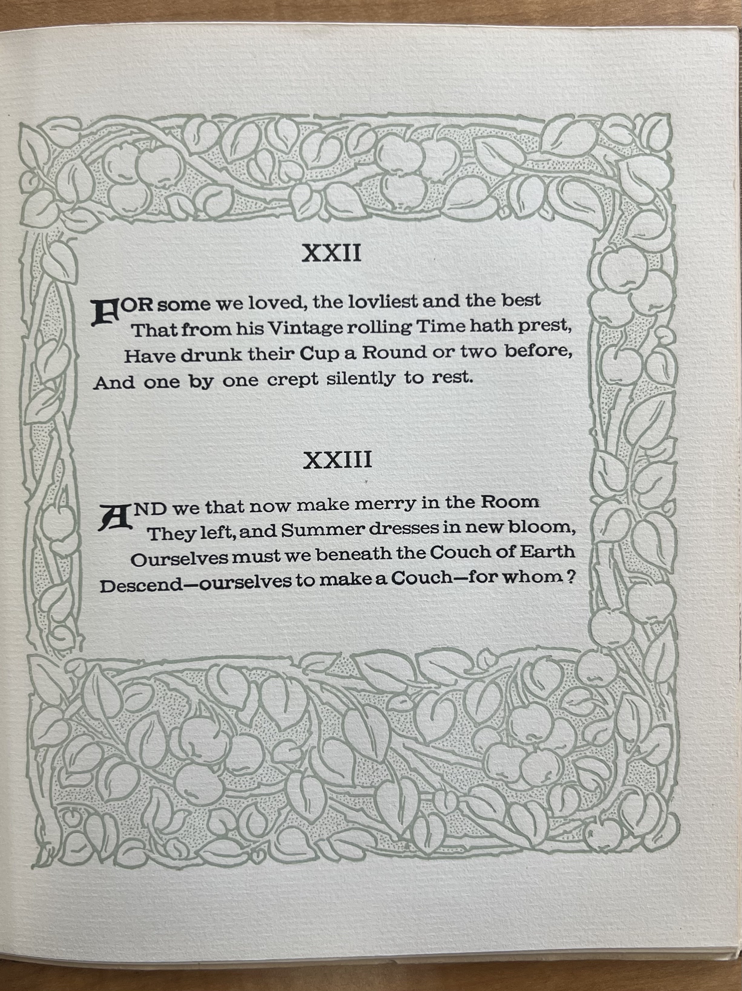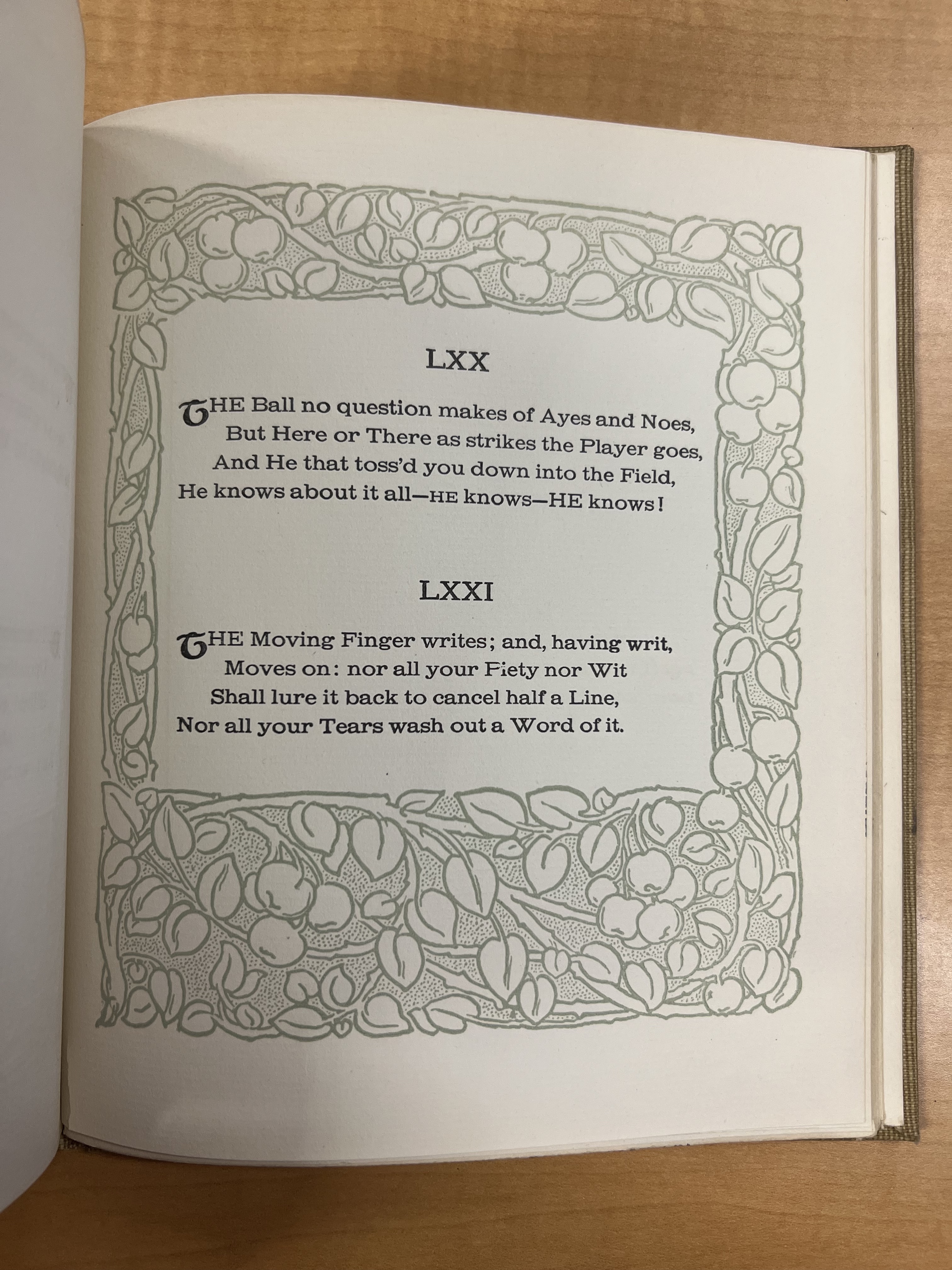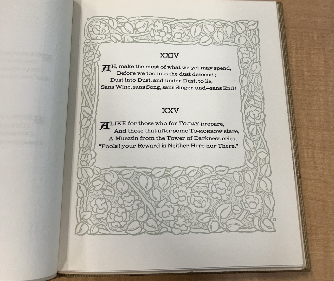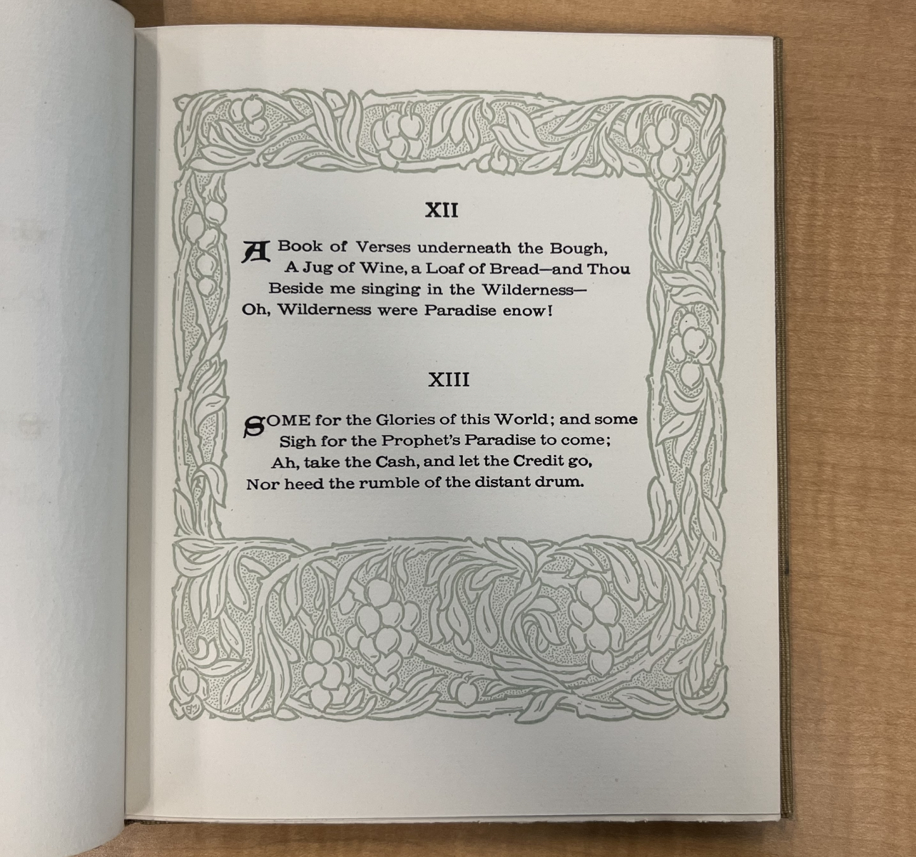 This exhibit examines the 1916 edition of Edward FitzGerald’s translation of the Rubáiyát of Omar Khayyám published by Dodge Publishing Company. The edition also features illustrations done by artist and photographer, Adelaide Hanscom Leeson.
