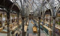 The Oxford University Museum of Natural History, located on Parks Road in Oxford, England, was built between 1855 and 1860, with the aim to bring together all aspects of science at Oxford. The departments of astronomy, geometry, experimental physics, mineralogy, chemistry, geology, zoology, anatomy, physiology, and medicine initially moved into the building. John Ruskin’s writings directly influenced the building’s neo-Gothic design. The museum consists of a large square court with a glass roof, supported by cast iron pillars, and features cloistered arcades with stone columns each made from a different British stone. The ornamentation of the stonework and iron pillars incorporates natural forms such as leaves and branches, combining Pre-Raphaelitism with the scientific role of the building. Statues of eminent men of science stand around the ground floor of the court—from Aristotle and Bacon through to Darwin and Linnaeus.