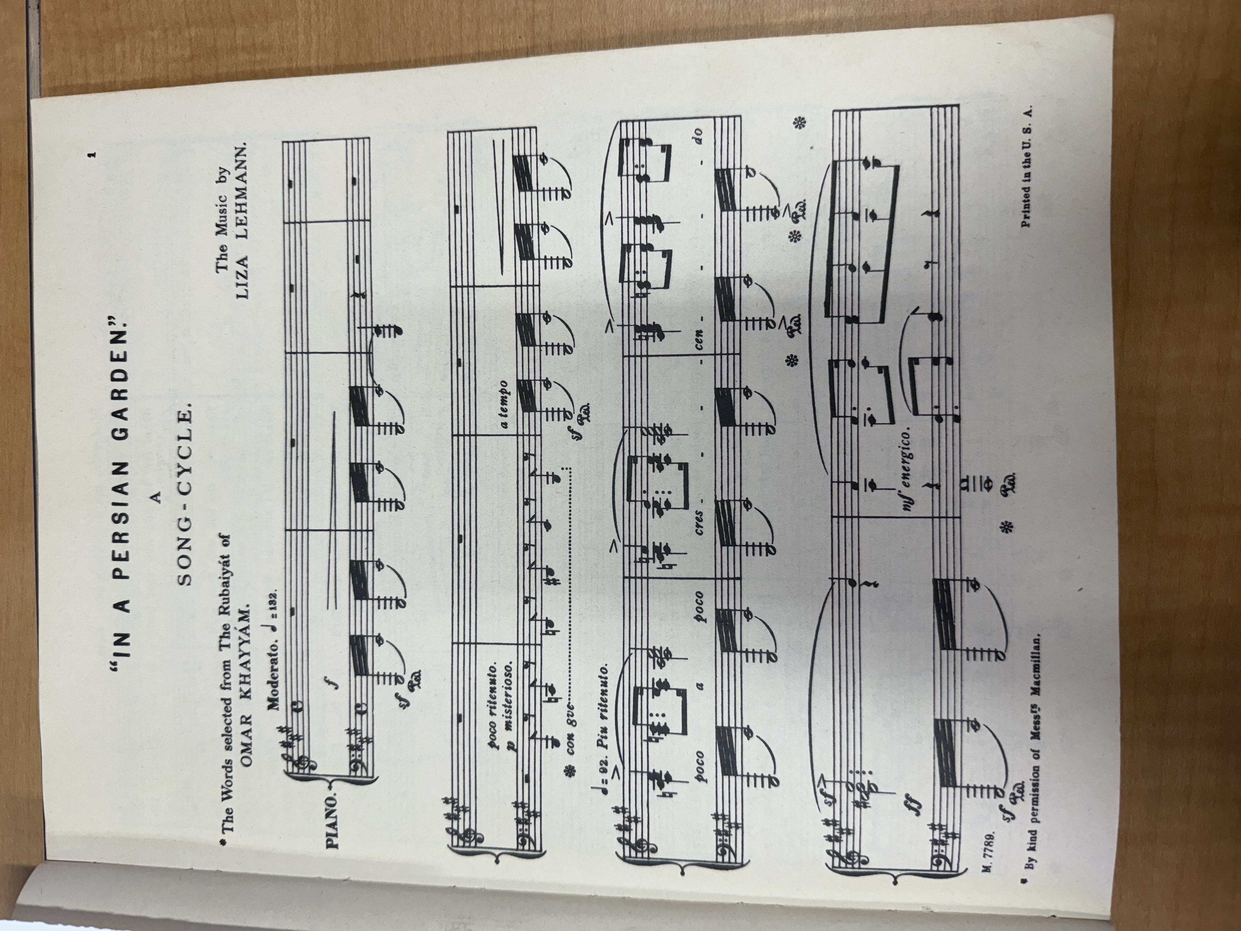 “In a Persian Garden: A Song Cycle for Four Solo Voices (Soprano, Contralto, Tenor, and Bass)” is an edition of the Rubáiyát of Omar Khayyàm that is composed by Liza Lehmann. (1862-1918) The score uses the Rubáiyát translation by Edward Fitzgerald, drawing form both the first and fifth editions of Fitzgerald’s translations.