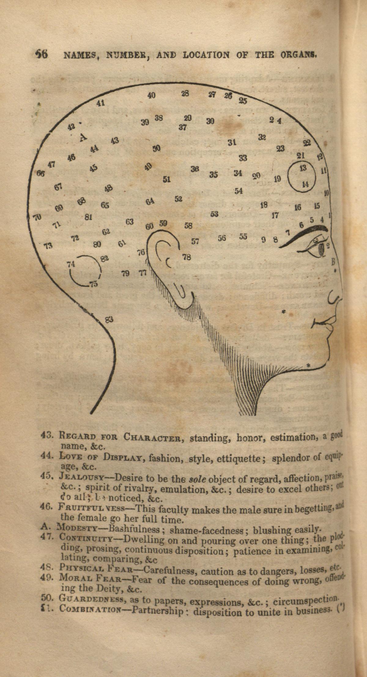 The image depicts a hairless head, with numbers mapped upon the exposed skin and face, indicating the location of the organs. The corresponding text identifies which characteristic or faculty is associated with each number.3The image depicts a hairless head, with numbers mapped upon the exposed skin and face, indicating the location of the organs. The corresponding text identifies which characteristic or faculty is associated with each number.