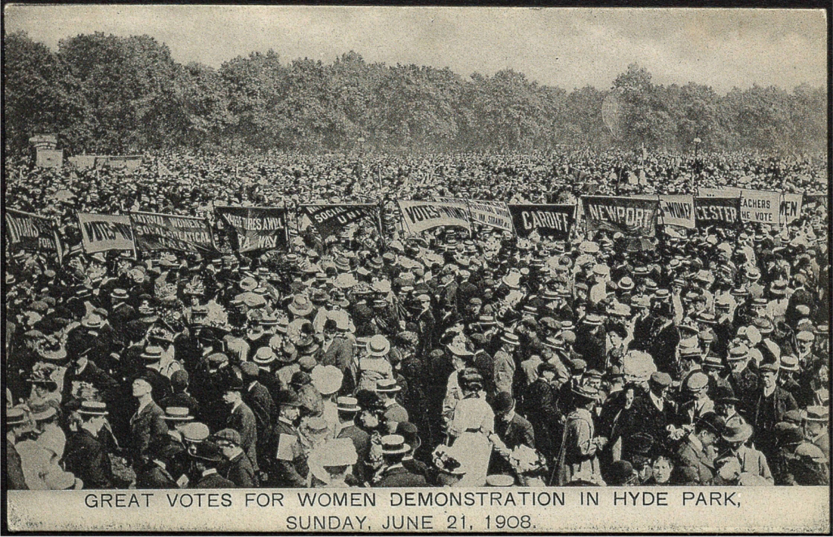 I recently came across this WSPU postcard in one of the local post offices near my home. I was there to simply send a letter to one of my dear cousins, when I noticed this card on the rack next to me. It depicts the demonstration for women’s voting in Hyde Park back in June of 1908. I was so surprised to see this and decided I must purchase it! I was at that exact demonstration all those years ago! I think if you look hard enough, you might be able to recognize me amongst the crowd. I remember it so vividly, because there was so much excitement throughout the park, and just being there was sort of breathtaking. The purpose for my attendance was to stand beside other women and protest for women’s voting rights in England. There were numerous large signs being held not only by women, but by some men too! I was pleasantly surprised by the sheer number of men who turned up at the gathering. It was very relieving to see that we were no longer fighting alone for this important change. Now, I feel as if we are getting closer to our goal every day, especially with the rising number of supporters throughout England. This was six years ago, and since then, there have been so many more demonstrations throughout London. Now, they are much bigger than this one was! At this moment, I feel that the right to vote for women cannot be but a few years away! We have accomplished so much for ourselves despite being told as children that we must depend on men throughout our lives. I think we are finally starting to show that women are just as strong, if not stronger than the men.