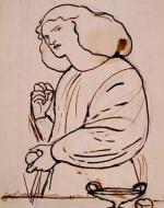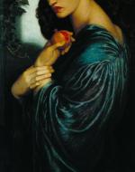 In this study for the painting, Rossetti did not use the ivy-branch in the background or the incense-burner, as the attribute of a goddess. The hands holding the pomegranate were still relaxed, not as tense as in the later versions; and the eyes, though contemplative, seem to hope that she is only visiting the underworld. Perhaps Proserpine still kept too much of human in Rossetti’s mind.