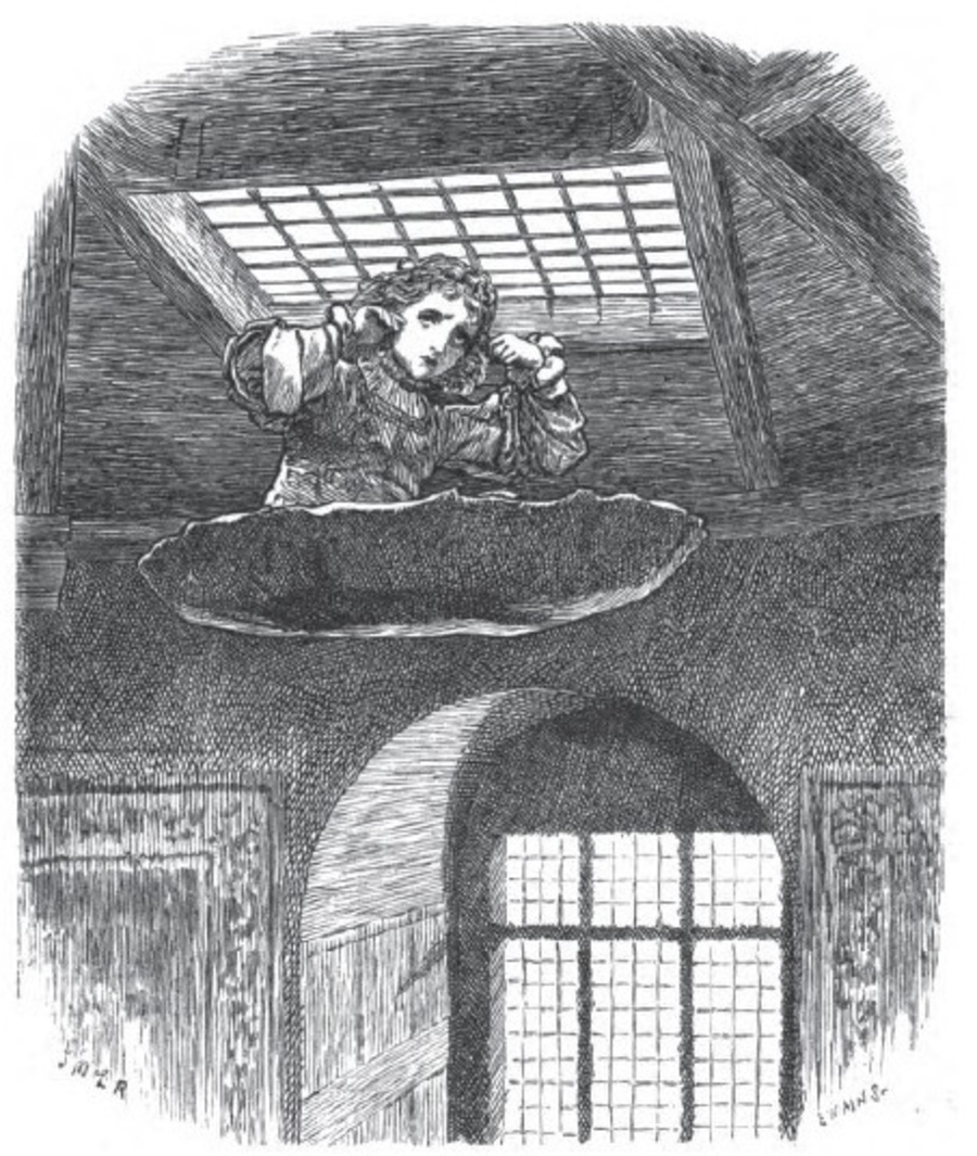 In this image, Prince Dolor is lifting off through the ceiling on his cloak—his face full of hope and wonder. He cannot walk, but this cloak gives him something his body can’t: the power to move and to explore. It is more than just magic for him; it fills the gap where his legs are. This is similar to how some people today rely on things that help them move (such as crutches), giving them a way to live on their terms. The cloak becomes a stand-in for what we now call prosthetics—not just tools, but a connection to the world beyond the room.