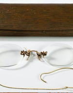 Within the Victorian period, spectacle and eyeglass use became more widespread (Almond 268). The glasses in this particular image are known as rimless frames, invented between the years 1825-1840, although at the time, they would have been marketed or described as “invisible” (Almond 269). The rimless, or invisible, glasses were created with the intent to conceal, as many people desired discreetness and the ability to “hide their defect,” since visual aids as assistive devices were still subject to forms of stigma, as they drew attention to the “abnormality of vision” in individuals, therefore indicating that person was outside societal norms or standards (Almond 276). This is interesting in the connotations it has to the medical model of disability, with the notion of “curing” abnormalities and catering to the idea that disability, especially visible disability, is “wrong.” Although it is true that prosthetics do not cure, in the sense of getting rid of a disability altogether, they do function to “fix” so-called defects and help “normalize” an individual, rather than changing or fixing the surrounding environment to make it more accessible. Other forms of glasses at the time include those made with steel frames or handfolders, which could be made more decorative with carved designs (which still did not indicate acceptance or a wish to show off, but the hope to mask) (Almond 271).