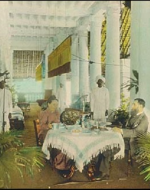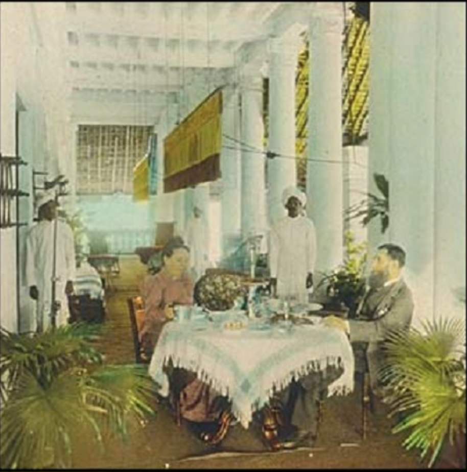 The Punkah was a ceiling fan which had to be pulled and released repeatedly to work. It was almost always controlled by servants while the wealthy enjoyed their downtime indoors away from the extreme heat. You can see it here, yellow and brown against the stark white ceiling.