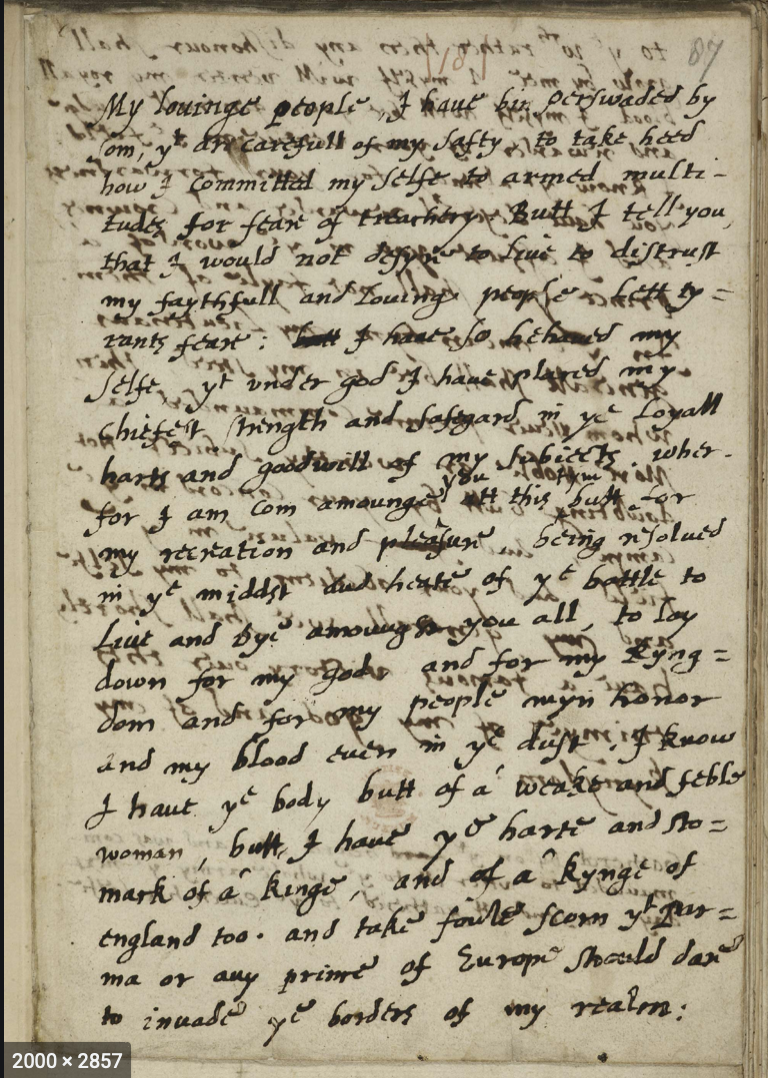 Citation: Elizabeth I. Elizabeth's Tilbury Speech. 1588. British Library, 2020.