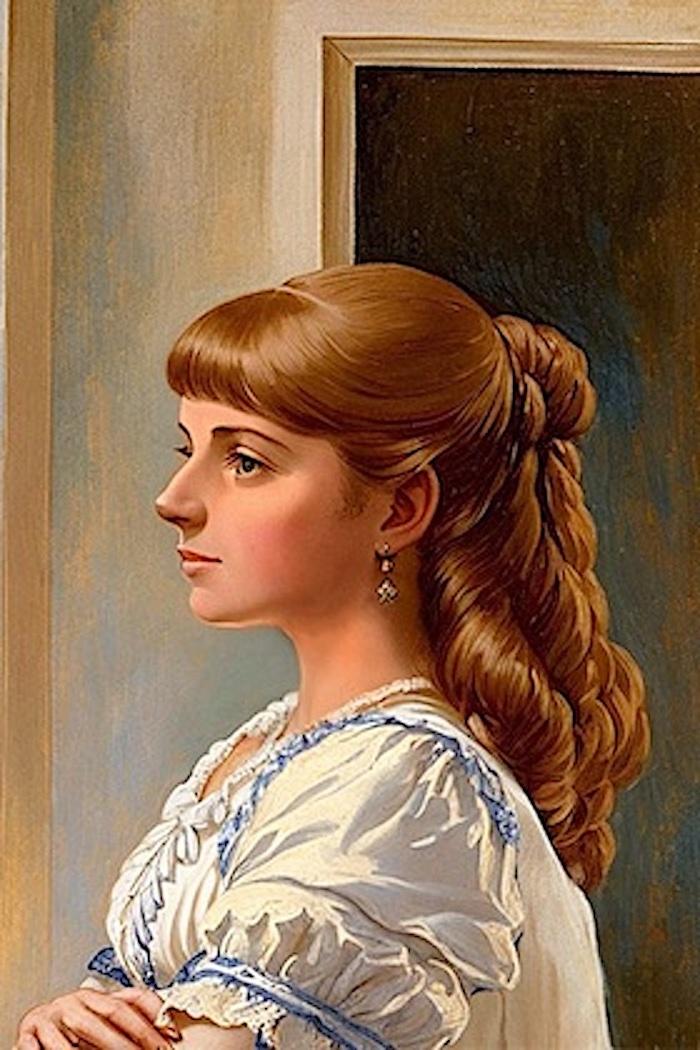 Fig. 1. Self-portrait in Regency style, created by Molly Jordan with AI prompt "grainy Victorian oil paint portrait of a woman with middle-parted bangs leaning on a white wall wearing a regency-era blue dress and a yellow background," Playgroundai, version 8, 22 Sept. 2023. Before attempting to make portraits for the Jane Austen characters, I wanted to begin by making myself a Regency-style self-portrait, much like the silhouette portraits we made in class at Skidmore's IdeaLab. My goal was to learn a new platform, Playgroundai, and get used to the creation process with this new site. I originally used an image of myself as a base, then developed and edited my prompts to generate an image closest to what I wanted. I think overall in my collection, this image came out as the closest to accurate Regency-era portraiture because of the image's closeness to the style of oil painting of the time. This image took me the longest by far because I was trying to learn a new program, but I was also very concerned about creating an image that looked like it could have come from the era. I struggle with historical accuracy in the rest of my images, and I wanted at least to make one example of a historically accurate image. Portraiture is important to the Jane Austen novels about courting and romance as well as wealth and status; the color and quality of the portraits become someone's legacy because people didn't have photography to represent them, so representing myself in the period accurately was important to me.