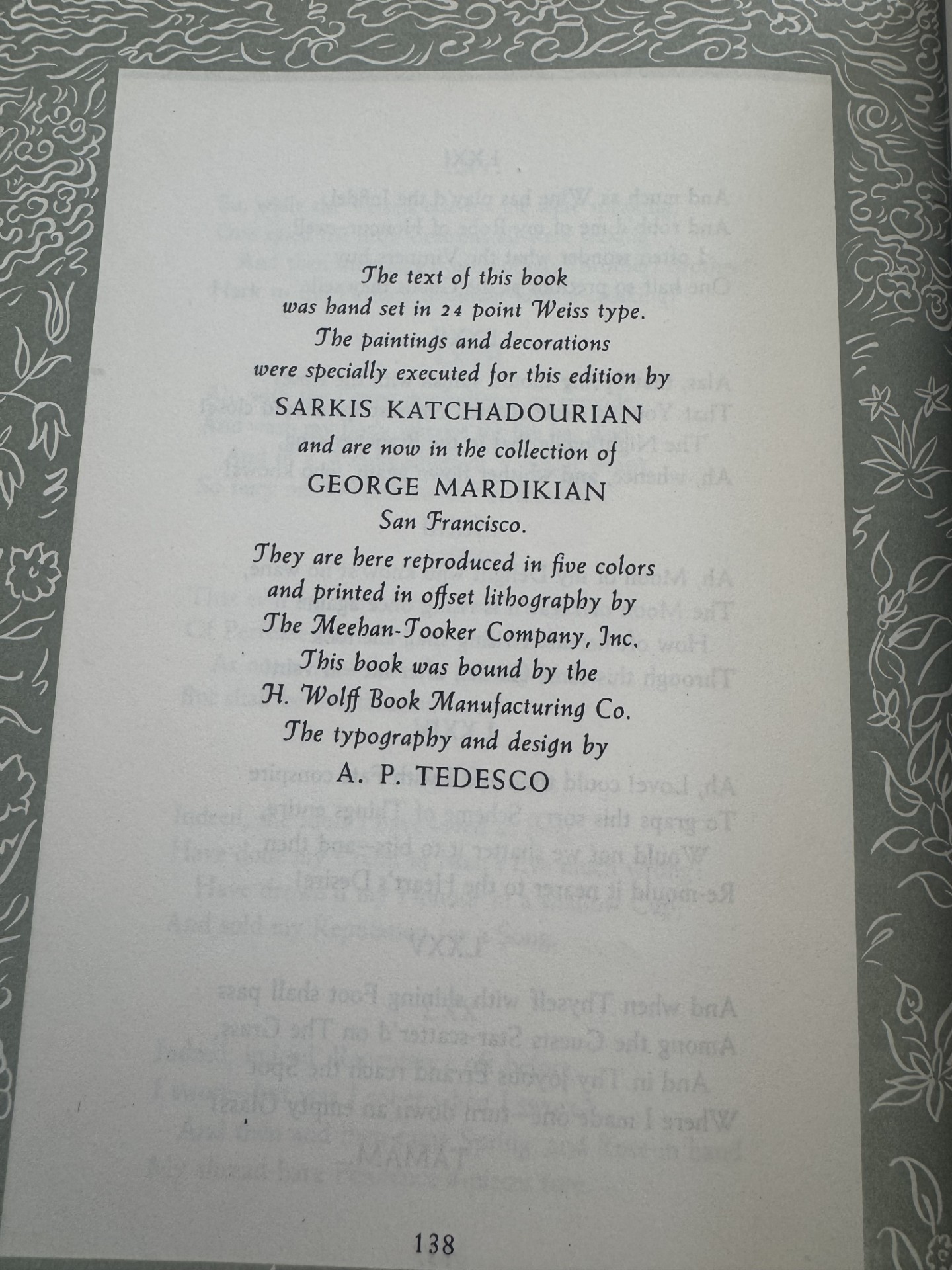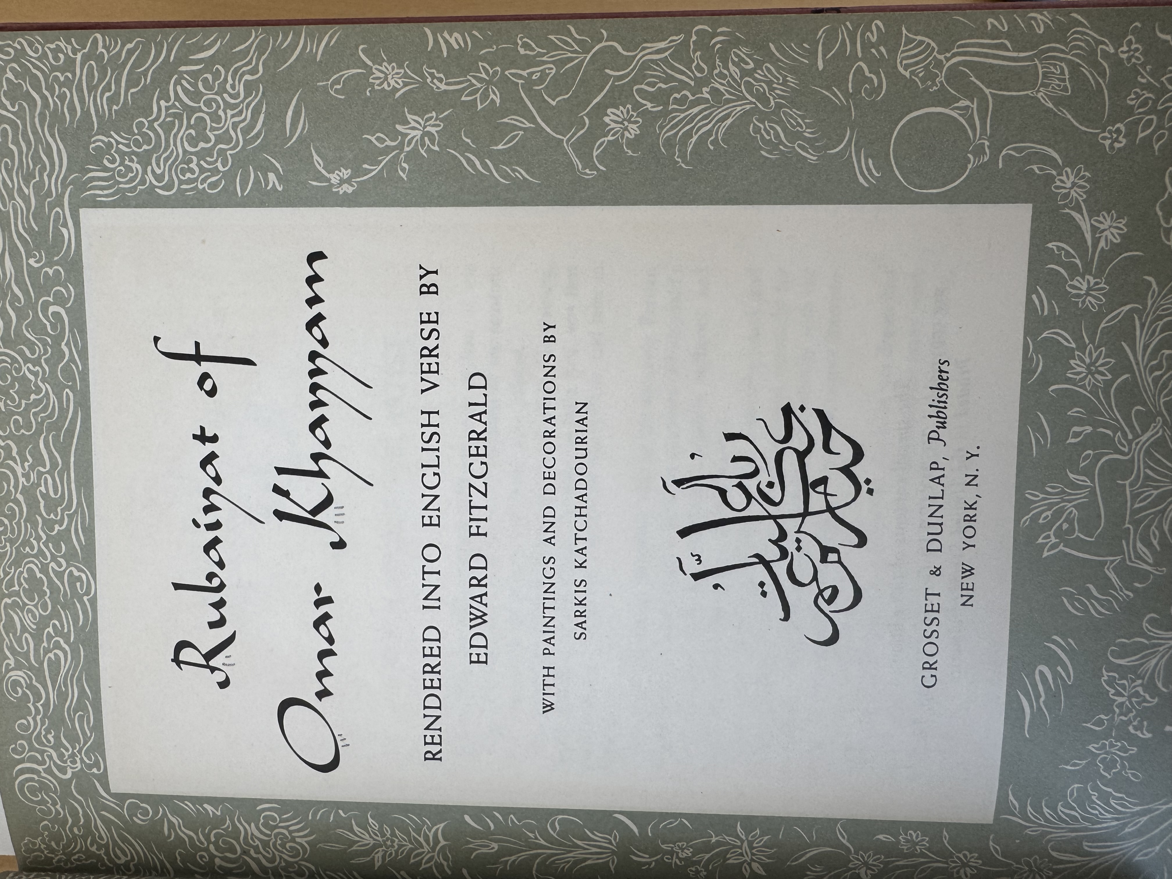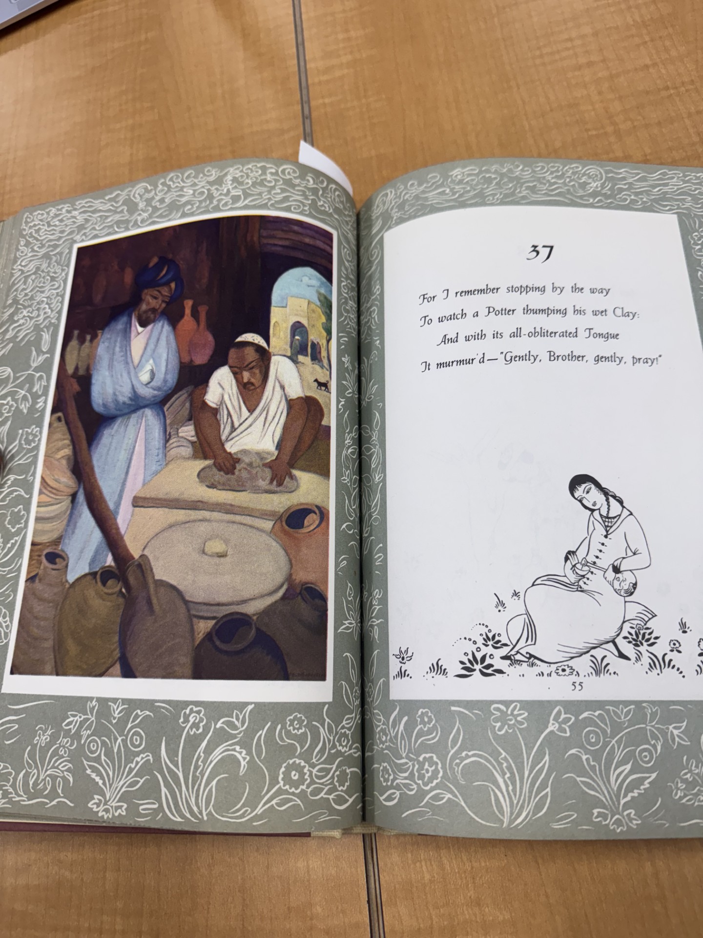 A detailed analysis of Omar Khayyám's Rubáiyát sourced from The Memorial Book Fund of Oregon State University, and labelled #65 within the Dr. Sigurd H. Peterson Memorial Collection. This 1946 edition was published by Grosset & Dunlap and illustrated by Sarkis Katchadourian. The vibrant images greatly impact the reading experience of the volume. Katchadourian includes either a wine glass or bottle in every image within this book, leaving no question that this imagery is important to the reader. Other analogies from the text such as the potter make an appearance alongside their respective stanzas. This edition contains both the Fourth Version of the Rubáiyát from 1879 and the First Version of the Rubáiyát from 1859. Boasting both saturated illustrations and an embossed hardback cover, this beautiful Rubáiyát is classified as a gift book, and is individual from others due to it's inclusion of alternate translations. One of the many unique Rubáiyát editions protected by the Special Collections and Archives Research Center at Oregon State University, this volume holds much to be explored.
