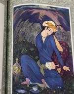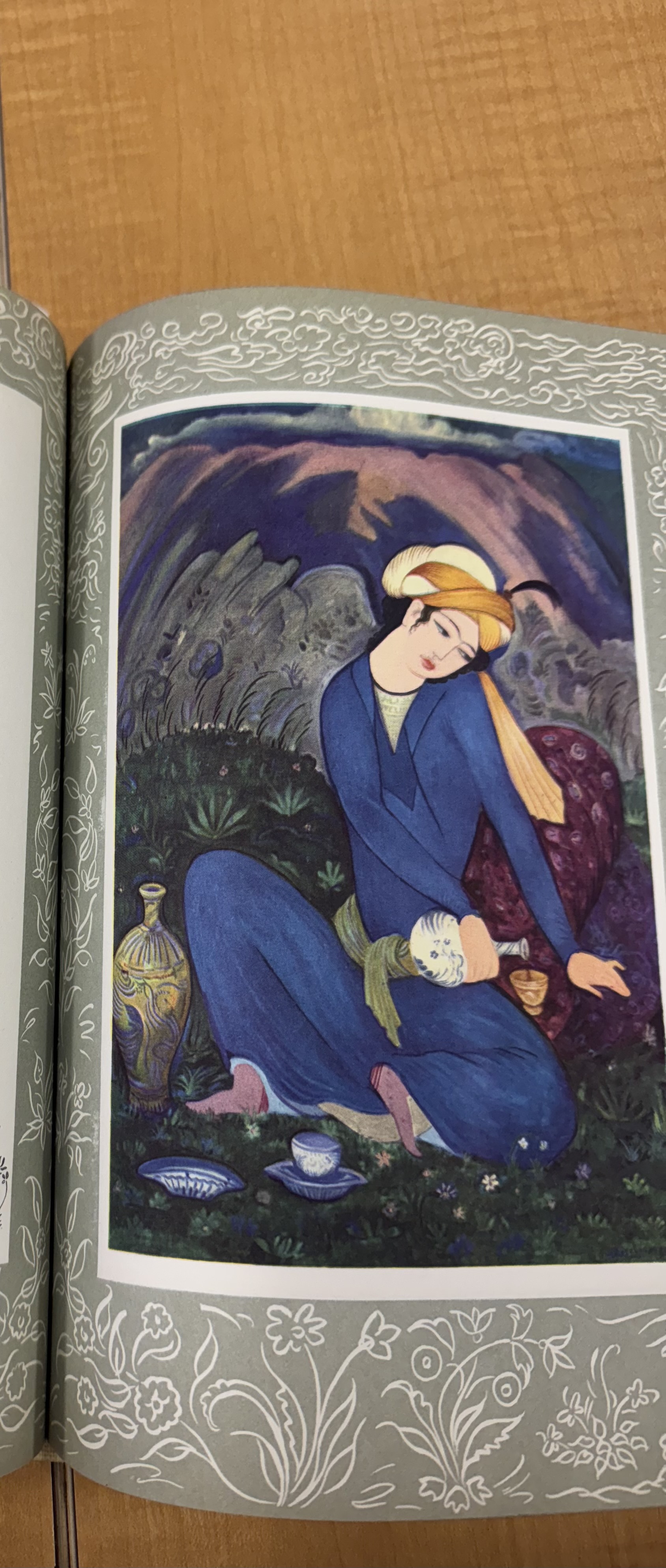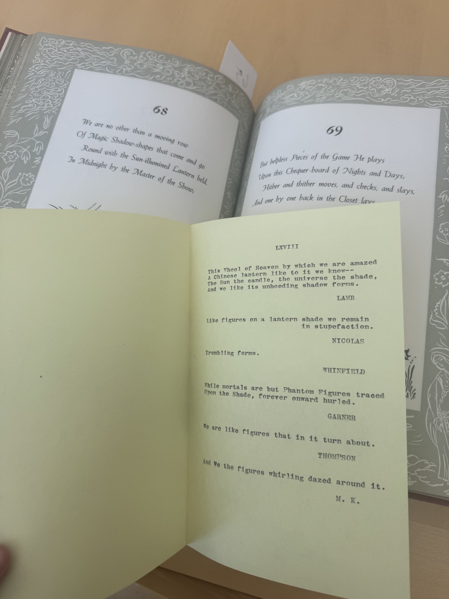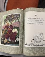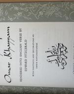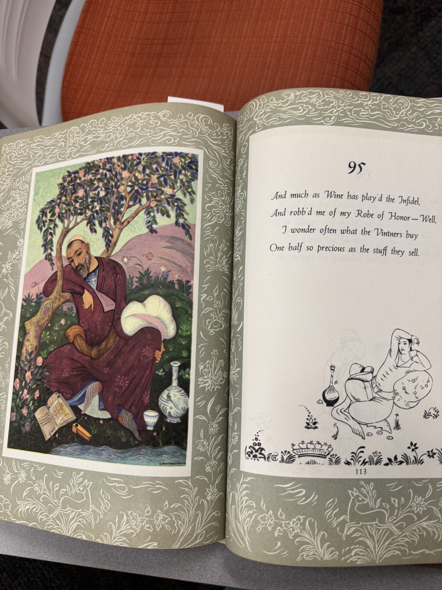 A detailed analysis of Omar Khayyám's Rubáiyát sourced from The Memorial Book Fund of Oregon State University, and labelled #65 within the Dr. Sigurd H. Peterson Memorial Collection. This 1946 edition was published by Grosset & Dunlap and illustrated by Sarkis Katchadourian. The vibrant images greatly impact the reading experience of the volume. Katchadourian includes either a wine glass or bottle in every image within this book, leaving no question that this imagery is important to the reader. Other analogies from the text such as the potter make an appearance alongside their respective stanzas. This edition contains both the Fourth Version of the Rubáiyát from 1879 and the First Version of the Rubáiyát from 1859. Boasting both saturated illustrations and an embossed hardback cover, this beautiful Rubáiyát is classified as a gift book, and is individual from others due to it's inclusion of alternate translations. One of the many unique Rubáiyát editions protected by the Special Collections and Archives Research Center at Oregon State University, this volume holds much to be explored.