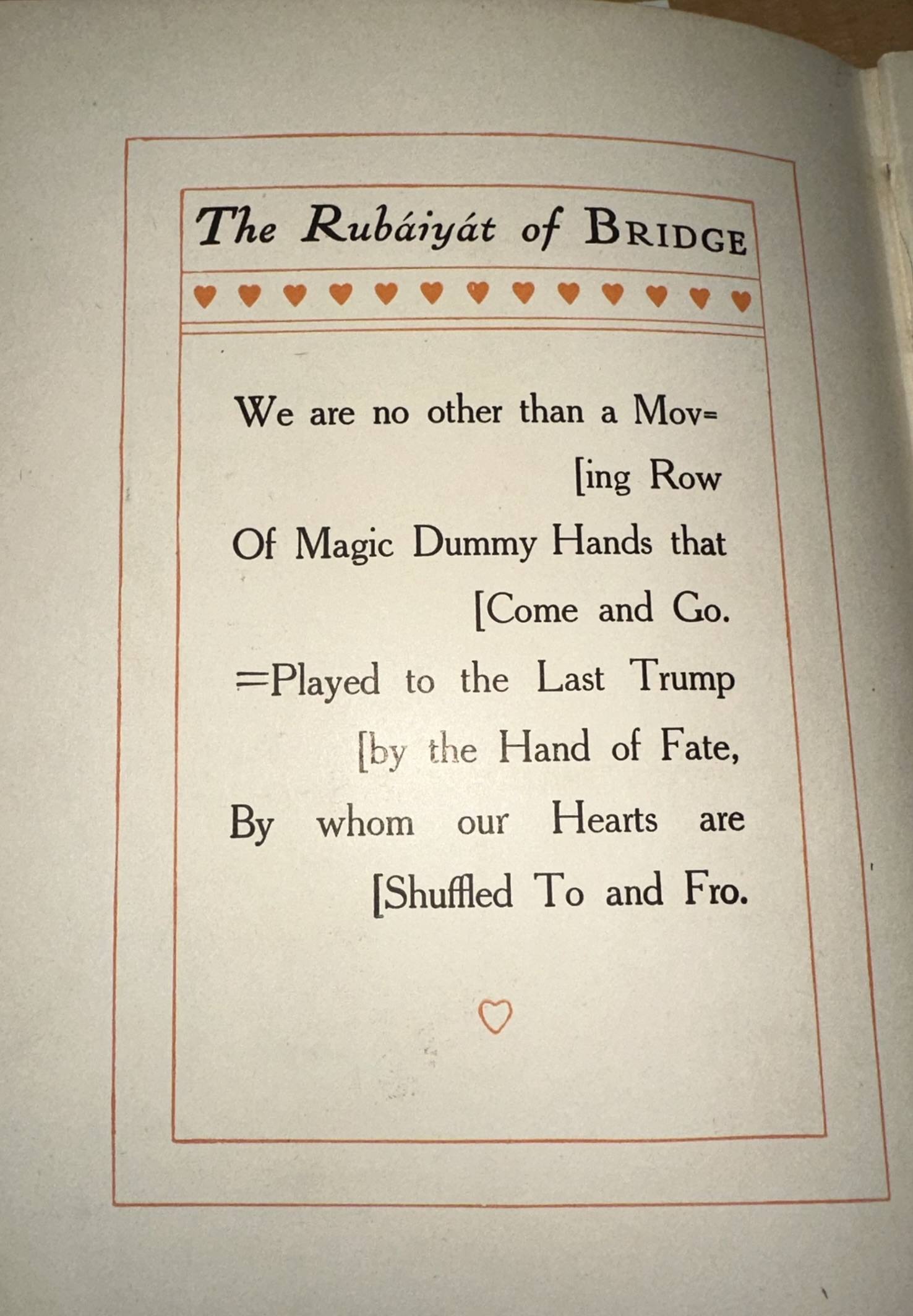 The Rubáiyát of Bridge is a playful and clever twist on a literary classic, the Rubáiyát of Omar Khayyám. Carolyn Wells takes the poetic style of the original and gives it a humorous spin, this time, centered around the game of bridge. She turns lofty reflections on fate and time into lighthearted musings about bids, partners, and the ups and downs of the card table. It is also accompanied by some illustrations by May Wilson Preston which follow this playful vibe of the story told by Carolyn Wells.