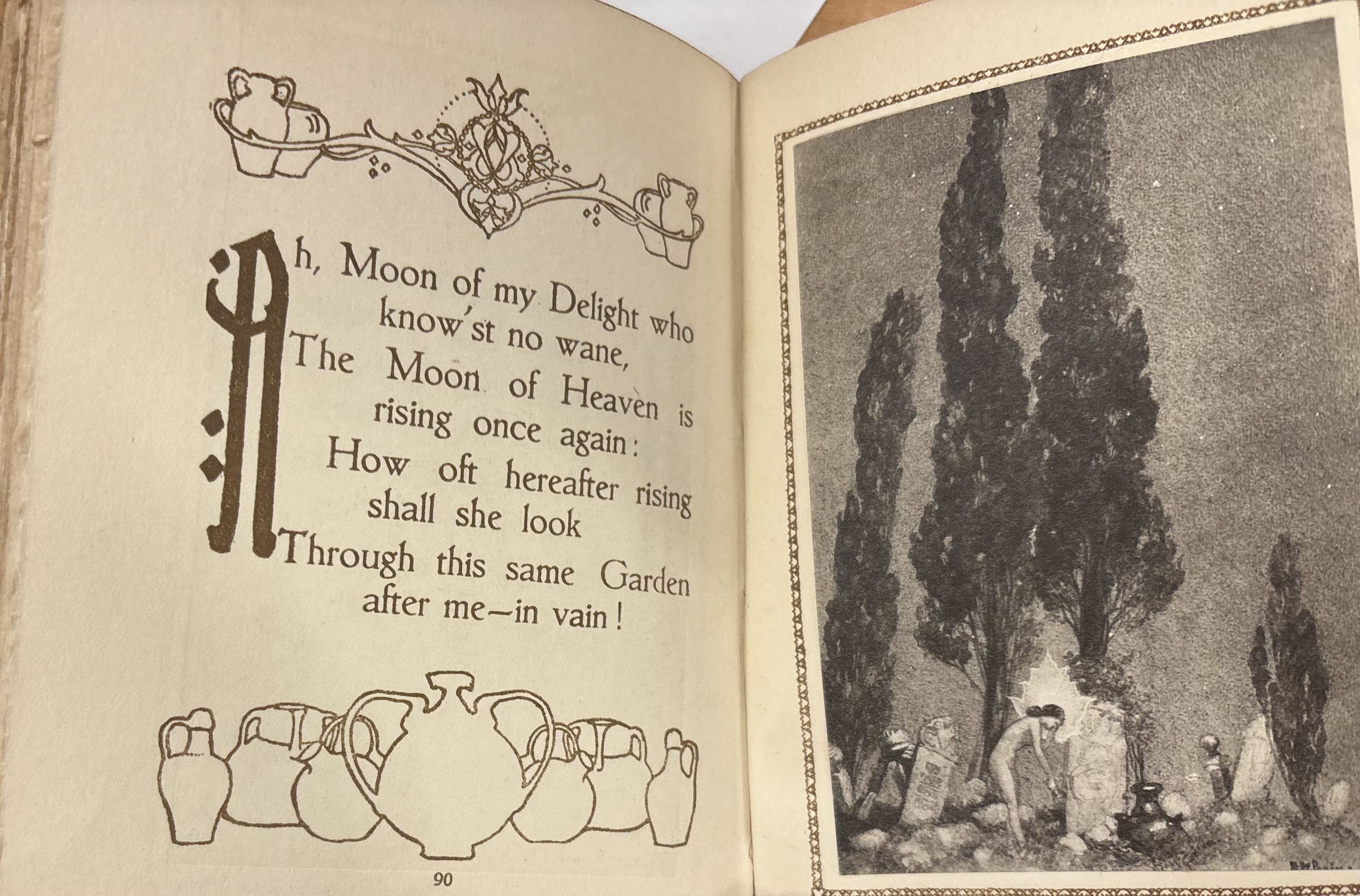 Oregon State University has a collection of gift book editions of the Rubáiyát by Omar Khayyam as translated by Edward FitzGerald. This collection is kept in OSU’s Archival Research Center. This collection of gift books is called the Dr. Sigurd Peterson Collection, but not much is known about how exactly Sigurd Peterson acquired this collection or for what purpose.