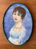Watercolor Portrait Miniature of Mary Pearson, Model for Lydia Bennet, 4.25" x 3", by Kira Molnar, 2023. My finished recreation of William Wood's portrait of Mary Pearson showcases her in a blue Regency style dress and a topaz colored necklace. I opted to add a darker blue/purple background, beginning first with watercolor, and then going over it a second time with colored pencils for a more shiny, textured surface. Only the background received the added layer of colored pencil, while the main figure of Mary Pearson remains solely watercolor. I finished off my project by mod podging my finished painting onto my prepared wooden oval, before finally hot gluing an emerald green braided cord with scalloped edges to frame my portrait miniature.