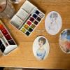 Crafting Process of Mary Pearson Portrait Miniature, Model for Lydia Bennet, by Kira Molnar, 2023. Using the 4.25" x 3" wooden oval cut out in the Skidmore's IdeaLab for size reference, I began my project by cutting out the same sized shape from regular printer paper. I started by making a rough sketch in pencil first, to get the general idea for proportions, before moving on to the more durable watercolor paper that I would use for my final version of the portrait. After redrawing the portrait a second time on the new paper, I then moved into adding the watercolor paints. I knew early on that there were some alterations I wanted to make from William Wood's original portrait, and I began this process by changing the shape and color of the dress as well as adding a necklace. I had felt that in the original, the color of the dress blended into the color of Mary Pearson's skin, and therefore I decided to opt for a more traditional Regency blue for my recreation.
