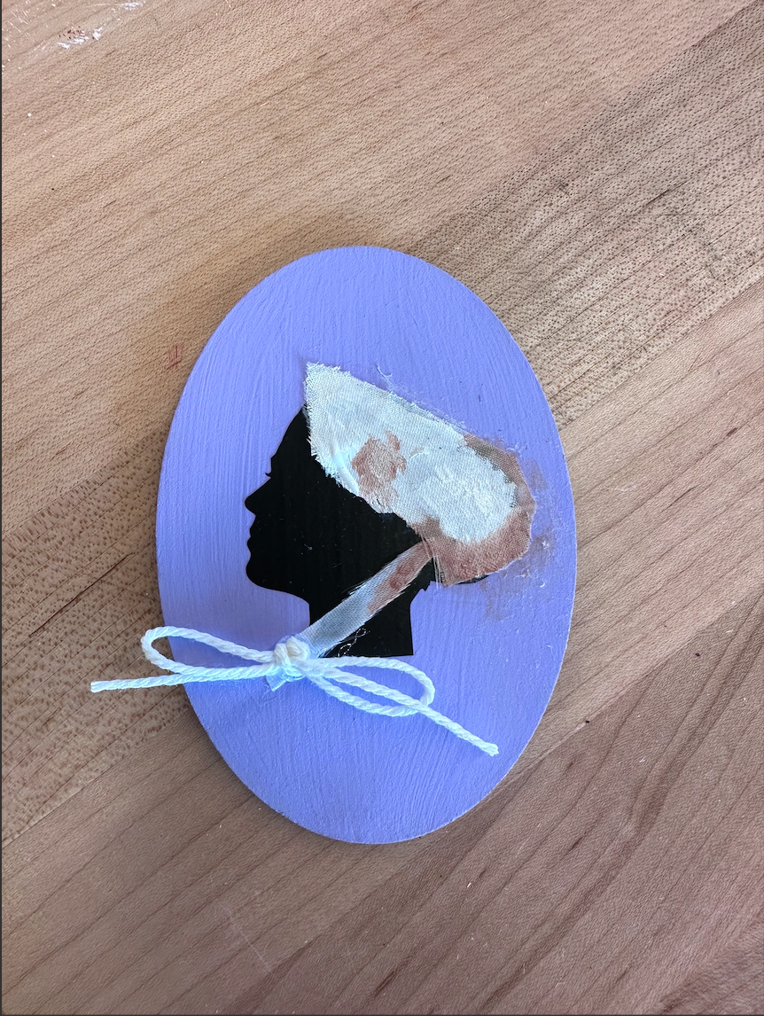 Crafting Process of Elizabeth Bennet Portrait, Photo taken by Catherine Golden, 2023. This photograph portrays transferring the black vinyl onto the painted wooden circle using transfer paper. After the vinyl was successfully transfered onto the frame, I glued a white fabric for the bonnet and painted over the bonnet with white paint. I tied a string into a bow and hot glued it onto the frame as well to make it look like the ties of her bonnet. Then, I used a sponge brush to tap on some brown paint onto the bonnet to make it look like dirt that covered Elizabeth on her walk from Longbourn to Netherfield Park.