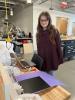 Crafting Process of Elizabeth Bennet Portrait, Photo taken by Catherine Golden, 2023. For this project, I started by finding a portrait picture of a woman with messy hair on the internet, and in the IdeaLab I transfered the picture into an application called Silhouette Studio. I used black vinyl and a silhouette machine in order to create the silhouette. Photographed is the black vinyl on a sticky purple board that is about to go through the machine in order to trace the portrait I had selected for my project.