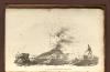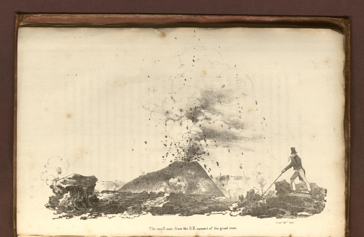 John Auldjo, the artist himself, stands on the far right of the image, poking the lava with a cane and holding a cloth over his mouth. In the background, the eruption of Vesuvius’ small cone, Monte Somma, blasts small bits of lava into the air; these fragments land near Auldjo. Palo, the highest point of Mount Vesuvius, is not shown in the image. An extensive jumble of what appear to be lava flows, hardened sediment, and rocks take up the foreground of the image.3John Auldjo, the artist himself, stands on the far right of the image, poking the lava with a cane and holding a cloth over his mouth. In the background, the eruption of Vesuvius’ small cone, Monte Somma, blasts small bits of lava into the air; these fragments land near Auldjo. Palo, the highest point of Mount Vesuvius, is not shown in the image. An extensive jumble of what appear to be lava flows, hardened sediment, and rocks take up the foreground of the image.