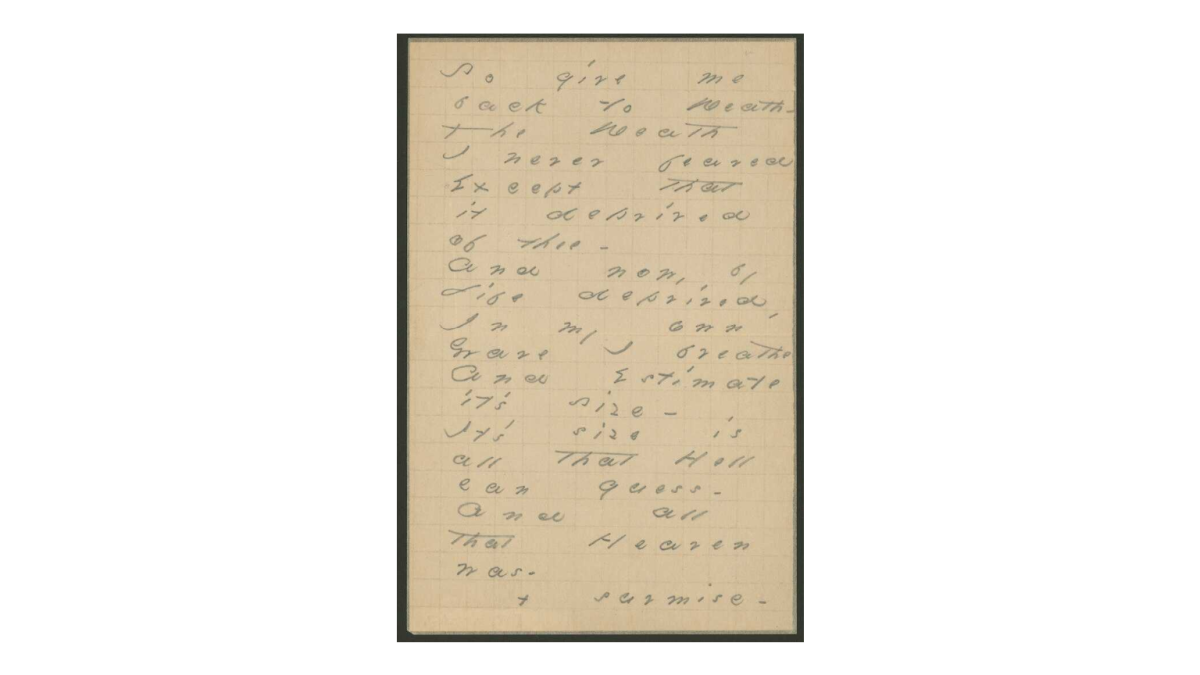 While it is well known that Emily Dickinson had a morbid attachment to death and often wrote on the subject, her last poem, "So Give Me Back to Death" was perhaps the most appropriately titled and themed as it was written on her literal death bed. Some time in the winter of 1885, just a few short months before her death, while Emily lay withering away in bed awaiting what she knew would be her end, she penned her last poem, "So Give Me Back To Death," which is pictured here. Emily's death came after two years of suffering from what was believed to be a chronic kidney disorder named Bright's Disease (now called nephritis), which eventually caused her heart to fail due to high blood pressure in May of 1886 at the age of 55. It is only appropriate then that the last words she wrote paid homage to her lifelong obsession with and inspiration from that which most fear- death.