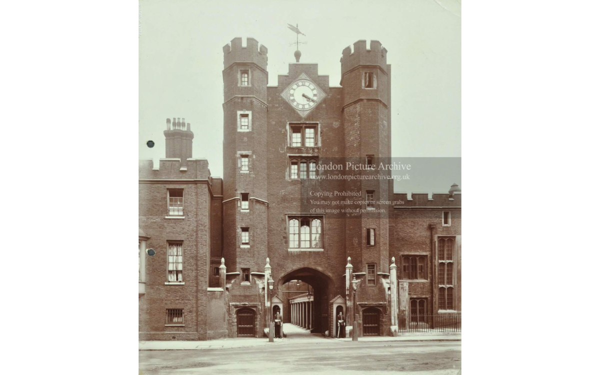 “St James's Palace, St James's Palace, Westminster LB: Clock Tower.” London Picture Archive, https://www.londonpicturearchive.org.uk/view-item? key=WnsiUCI6eyJrZXl3b3JkcyI6IlN0LiBKYW1lcyBwYWxhY2UiLCJrZXl3b3Jkc01vZGUiOjF9LCJGIjoiZXlKemJ5STZNWDAifQ&pg=207&WINID=1663602467444#NDP0WUbVI5QAAAGDVm8eGA/147204.