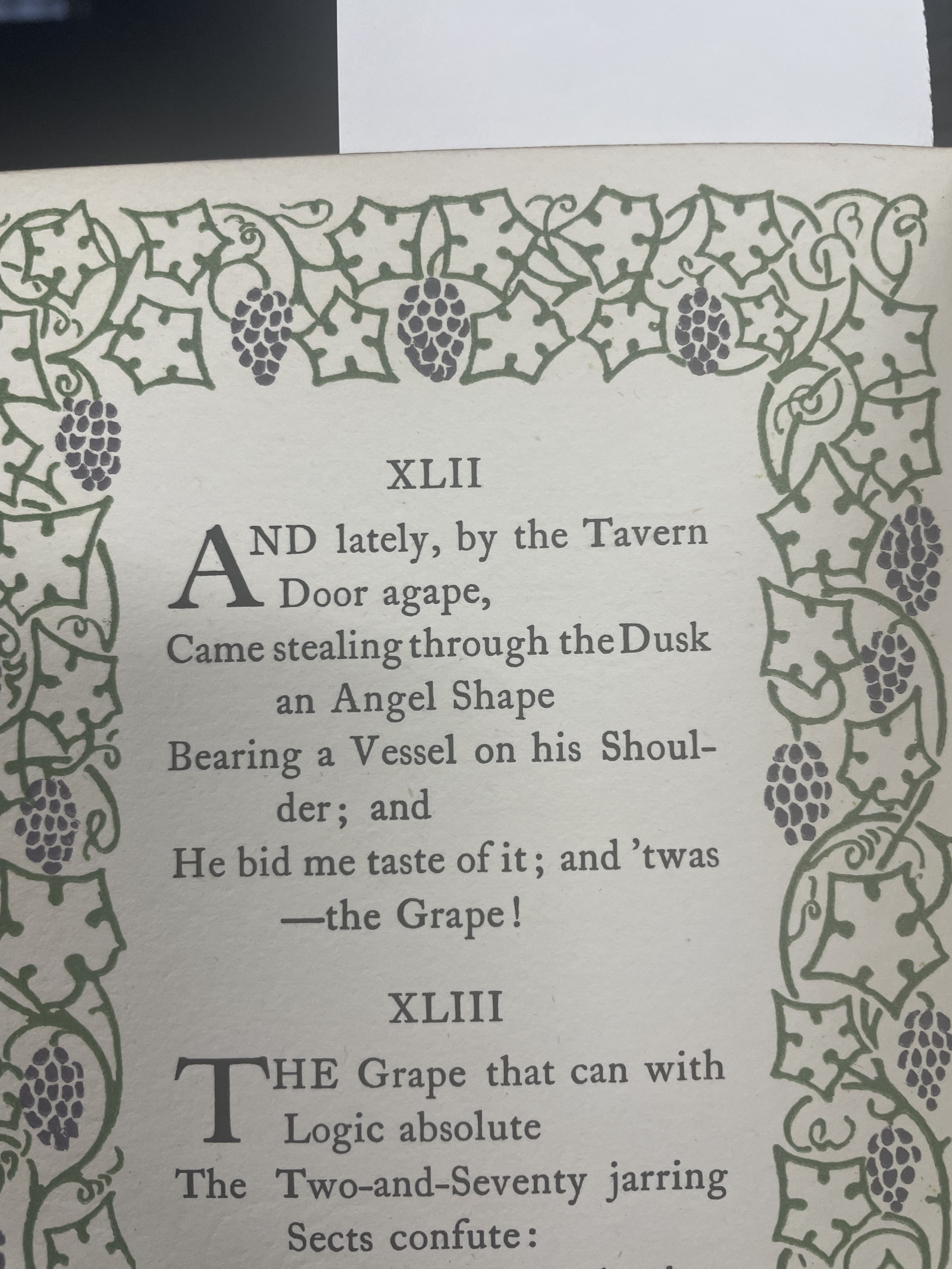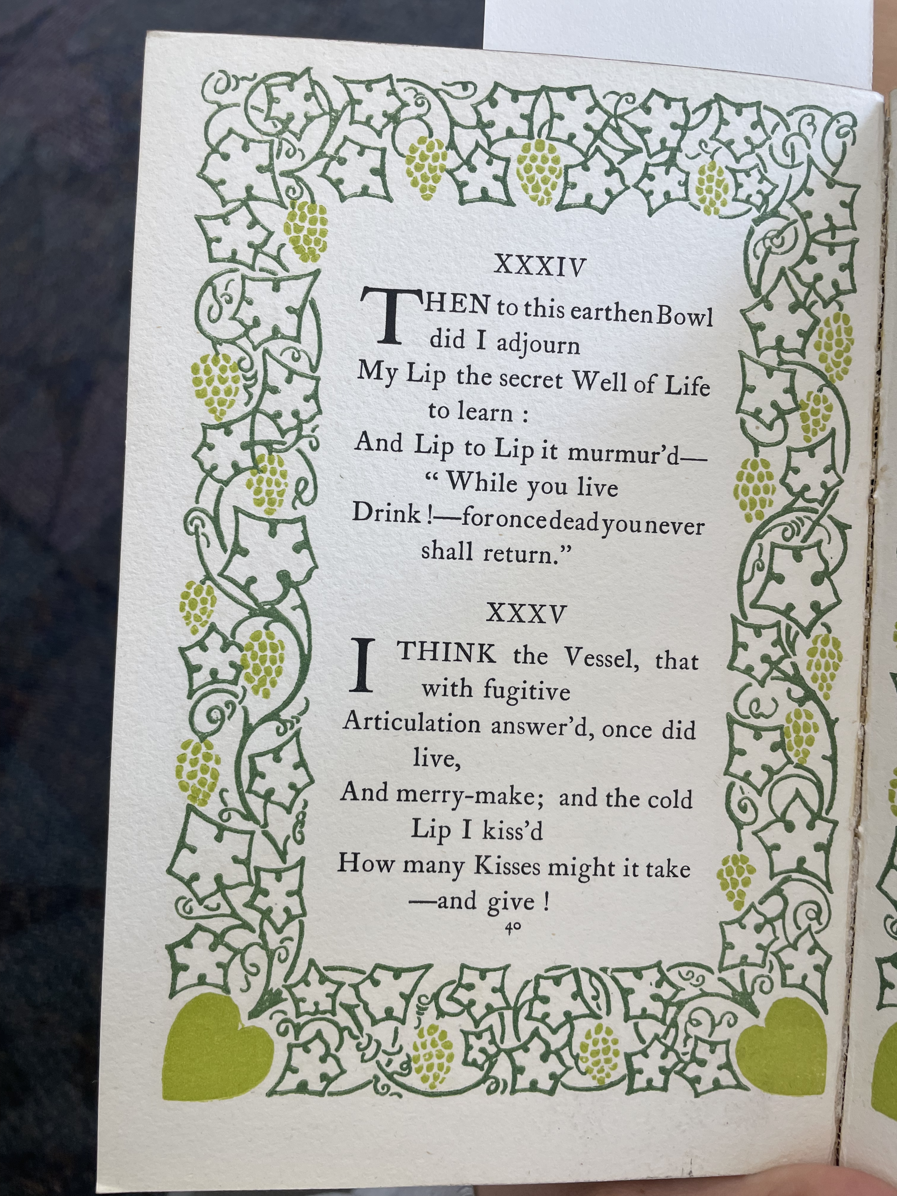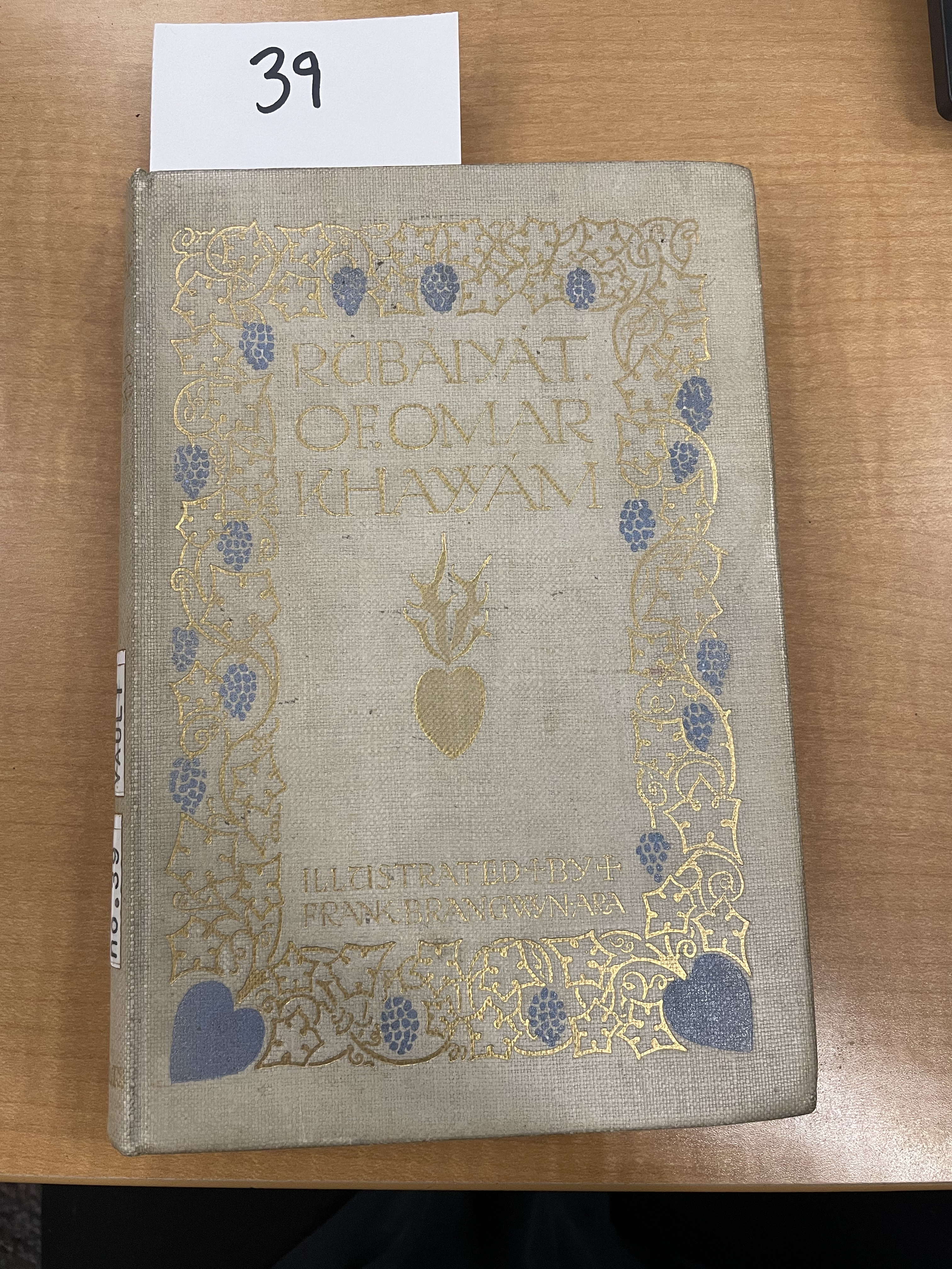 An in-depth exploration of a 1910 edition of Rubáiyát of Omar Khayyám by Alexis Baumgarten. Labeled #39 in the Dr. Sigurd H. Peterson Memorial Collection at Oregon State University's Valley Library. Illustrated by Frank Brangwyn and published by T.N. Foulis,