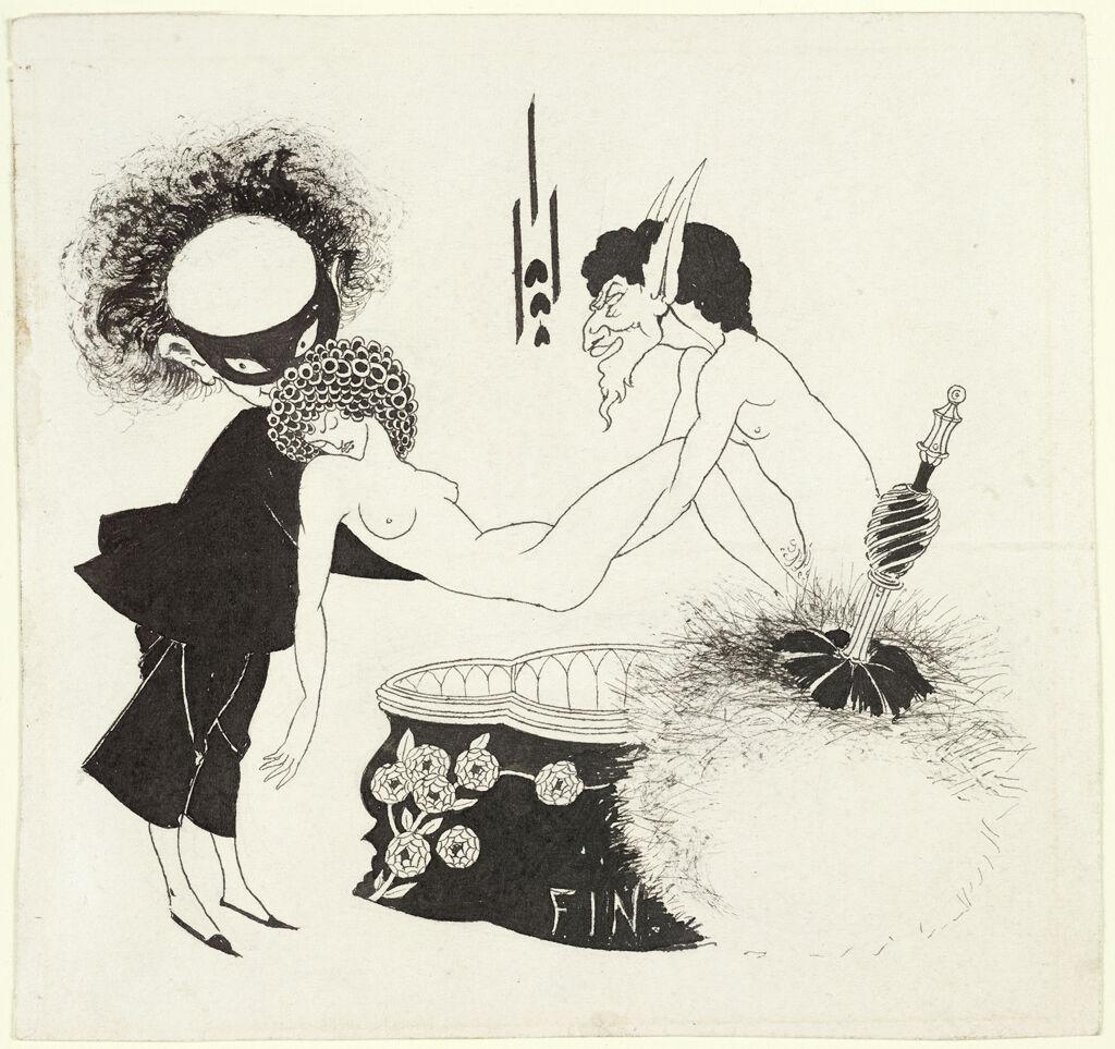 Aubrey Beardsley's Tailpiece is an illustration that was created for Oscar Wilde's Salomé published in 1893 . The illustration exemplifies themes of horror and the weird, particularly its use of groutesque eroticism. The image highlights two mystical creatures, one masked and one demonic, who are laying a nude women to rest. The figures holding the women do not have fixed definitions of gender or sexuality, instead embodying a distorted hybridized existence that blurs tarditional boundaries. Fernbach notes that Beardsley's illustrations for Salomé showcase "identities [that] are not fixed by gender or sexuality but are instead depicted as doubled, multiple, or shifting." (2) These elements create diverse, transgressive expression of desire, intertwining themes of attraction, repulsion, and power.