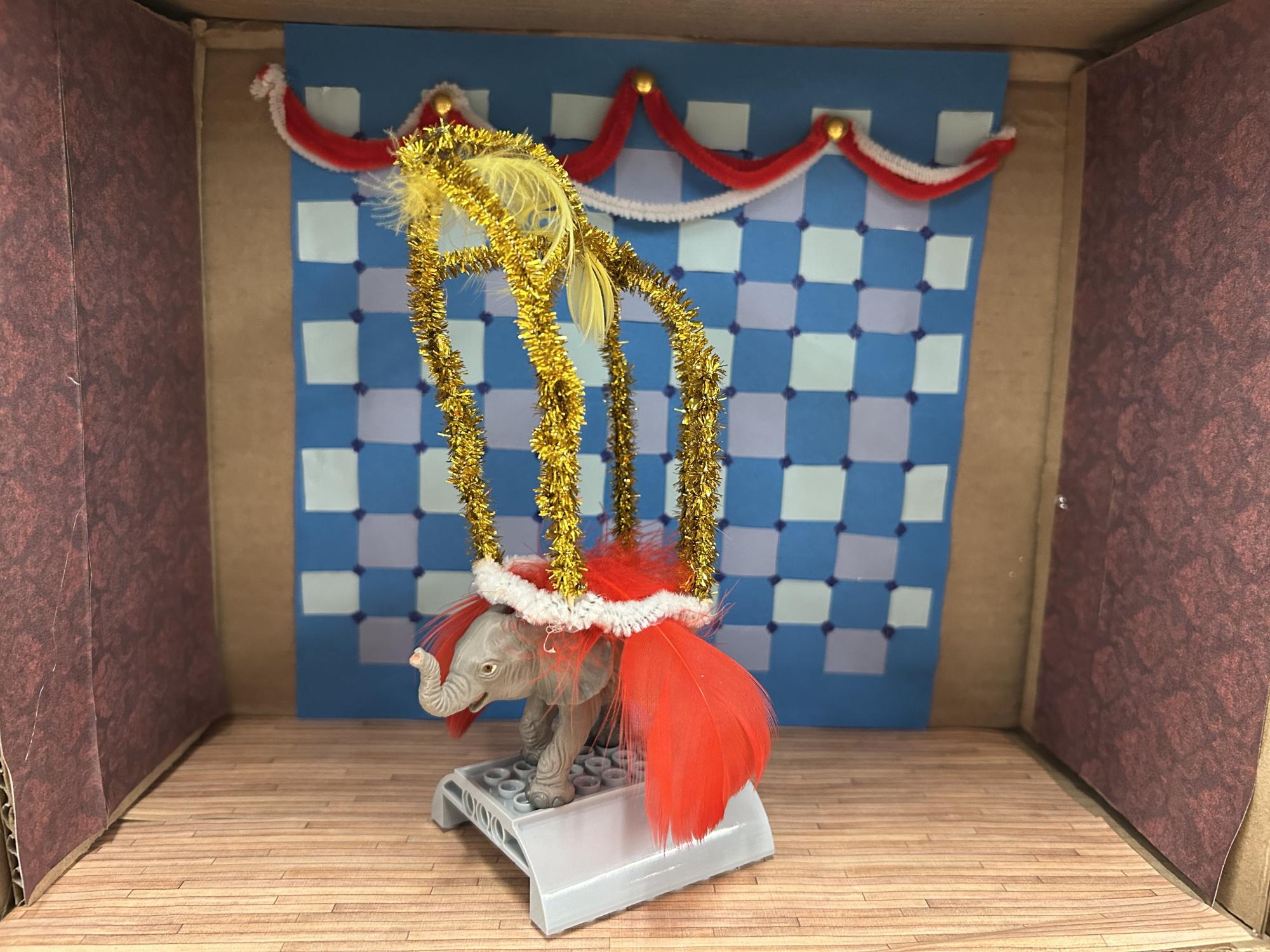 Booth Creation: Queen Victoria's Howdah, by Mary Timmons, 2025. In this photo, I have captured my rendering of the "India Court" display at the Great Exhibition of 1851. Using tinsel and pipe-cleaners, I constructed a model of Queen Victoria's howdah, gifted to her by Nawab Nazim of Bengal, and situated it on a model elephant meant to represent the large taxidermy elephant in the "India Court" display. For a more detailed summary of the "India Court" display, please refer to the next entry. I situated my model of the howdah atop a plastic elephant, which represents the taxidermy elephant that carried the howdah at the Great Exhibition. For the backdrop, I consulted Joseph Nash's print (pictured in the next entry), and I wove colored construction paper strips together to imitate Nash's rendering of a tapestry that likely hung behind the elephant in the original display. Finally, I acquired a deep red Victorian print to function as wallpaper for my diorama, and I utilized an illustration of wooden panels for the flooring of my display.