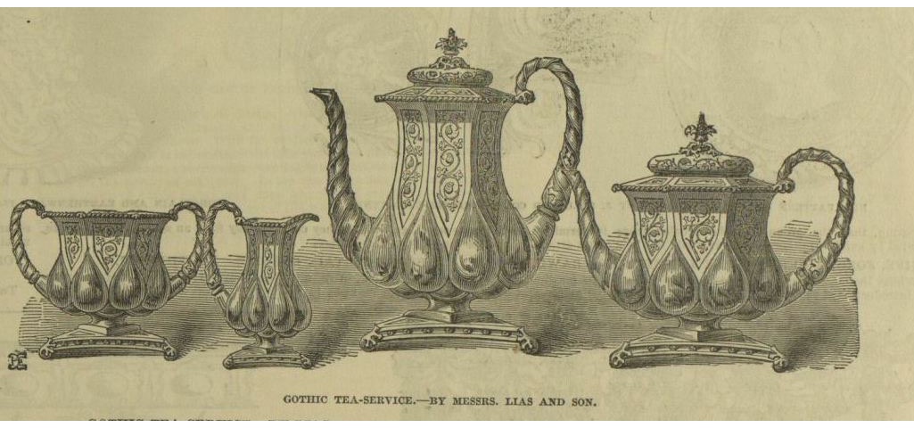 "Gothic Tea Service. By Lias." Illustrated London News, 2 Aug. 1851, p. 155. The Illustrated London News Historical Archive, 1842-2003, link-gale-com.proxy.uchicago.edu/apps/doc/HN3100028700/ILN?u=chic_rbw&sid=bookmark-ILN&xid=6ffd6291. Accessed 11 Feb. 2022.