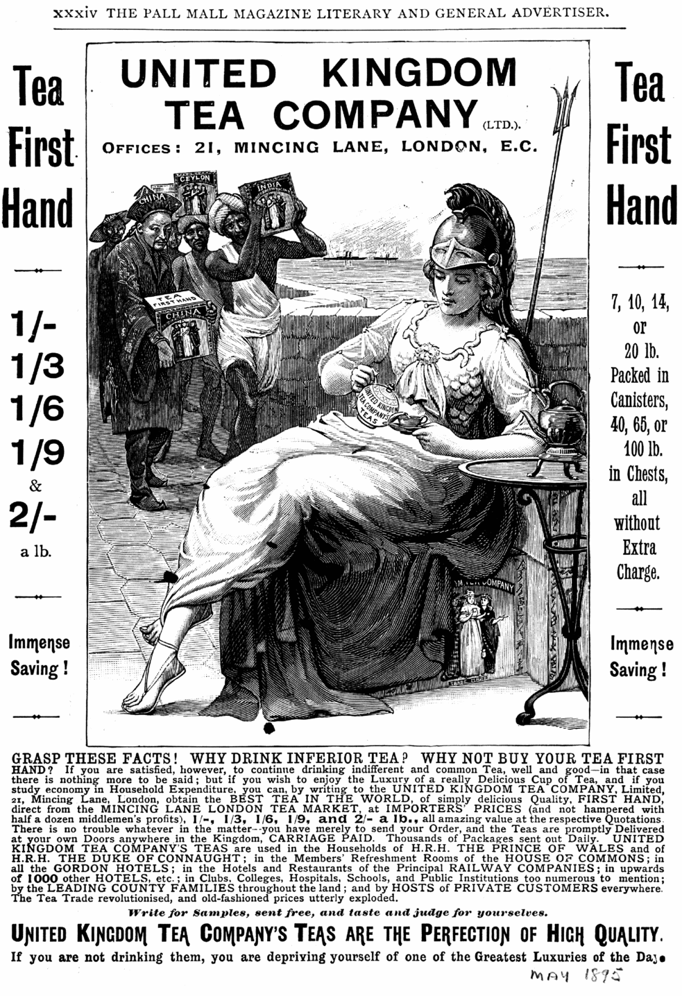 This image portrayed an advertisement for tea with connotations in English Empire. It was included in the article “Deeply Indebted to the Tea Plant”, as a reference for how advertising upheld imperial norms. The image demonstrates both the luxury and necessity status of tea, and the anxieties about importing, with the text of the advertisement claiming that it is attained directly without “middlemen”. The image highlights the work of other countries in procuring the teal, by labeling workers bringing the crates as “China” and “India”.