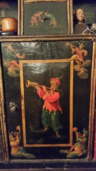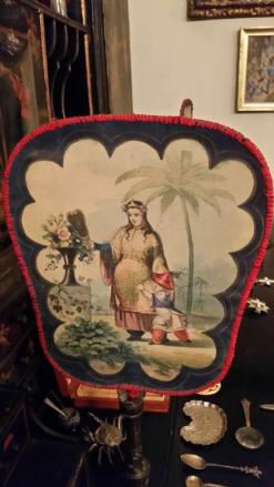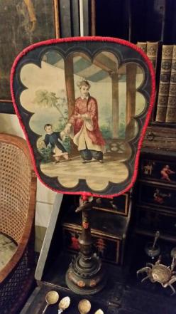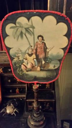 | circa. 1800 | Pair of Italian Brown and Polychrome Decorated Table Fans, 19th centuryEarly 19th century, English Chinoiserie table fans This pair of fans sits on the front flap of a bureau in the ante-room to Acton's bedroom. The fans date from the early C19th, and are part of the Western European craze for Chinoiserie. They are made of broad-woven silk; measure roughly 10" by 6", and have removable panels. They have no functional handle, but are mounted on a balustrade-style support - rather like a candle-holder - and a domed foot decorated with flowerheads. The fans comprise four different scenes, each having a recto and a verso. The scenes are more suggestive of Chinese motifs than directly representational. On the recto of Fan #1 is a woman - possibly pregnant - holding a small child by the hand, and standing in a scene which is both Westernized in its flower urn and tropical in its palm trees. The recto of Fan #2 depicts two adult males in front of a river or water, with a pagoda and, again, palm trees in the background. One man holds a scroll and is possibly a teacher or a trader. Verso of Fan #1 shows a man holding a child by the hand on a verandah - family motifs thus dominate on this fan. The recto of Fan #2 shows two adult women - one standing, one seated - again in an outdoors scene, with rather unclear foliage. The edges of all four images are scalloped, suggesting a formal, decorative vignette. There is a red fabric edge - possibly of rough silk - around the fans' edges. The craze for Chinoiserie in Western Europe was a product of considerable trade in Chinese goods from the mid C17th to the early C19th (see Chi-Ming Yang, Performing China: Virtue, Commerce, and Orientalism in Eighteenth-century England, 1660-1760 (Johns Hopkins University Press, 2011). The fans were designed for decoration and display rather than functionality, even as they referenced East Asian habits of fanning onself (habits very necessary, of course, in places like European crowded ballrooms!). Many of the supposedly Chinese designs were created and collected by French designers. In the mid-1730s the French designer Jean Revel (1684–1751) produced a number of chinoiserie silk designs in an early Rococo style, and from the mid-1750s Jean Pillement engraved fanciful chinoiserie designs that were drawn upon by other textile designers. These were brought together in his One Hundred and Thirty Figures and Ornaments and Some Flowers in the Chinese Style (London, 1767). His designs also appeared in such source books as Recueil de différentes fleurs dans le goût chinois, propres aux manufactures d’étoffes de soie et d’indiennes (London, 1760) . They were used by textile printers in England and France, and were further drawn on as sources for other decorative objects. London's Fan Museum has held several exhibitions of Chinese fans, which focus on more functional, wide-spreading, folding fans, rather than these two objects, which seem more intended for display. |