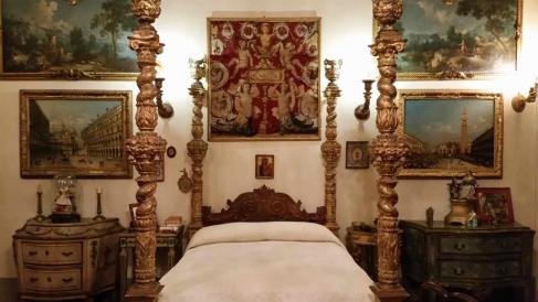 | circa. 1600 | Italian Giltwood and Walnut Four-Poster Bedstead, 17th century17th century, Italian furniture It is often said that a collector collects in order to build a safe world, an alternative world, a kind of nest. Sir Harold Acton's bedroom, his childhood bedroom, next to his parents' room, is a place he never moved from. In a house full of collections, he felt most at home in this intimate space filled with what we can surmise are his most beloved collections. In this treasure-filled room, the bed is focal point. It is the sanctum sanctorum of the collector's private room. The official description provided by the museum tells us that this bed is a seventeenth-century Italian giltwood and walnut four-poster bedstead. Examining the bed, particularly in the context of such an eclectic collection of beloved items, calls attention to its varied styles and finishes. The carving of the bedframe, headboard, and footboard, which are ungilded walnut, are distinct from the columns that are finished in gold gilt. The bedframe and headboard appear to be carved in a different style than the columns. These columns are topped with 4 urns, which have a different metallic finish than the columns themselves. This leads us to suspect that the bed is itself a collection of objects, styles, and perhaps even periods. However, it also seems like a perfect bed for an Anglo-Italian leading the villa life on a hillside above Florence. The bed's place within the composition of the room is also interesting. Two of the massive columns frame the putti under which there is a painting of the madonna and child, a visual blending of the classical and the Catholic. It is a composed world, the symmetry of which provides a structure that unites its disparate parts. For Acton, it is both a beautiful and sacred space. (Might the bed's columns be repurposed from an architectural element in a church?) The space feels like the space of an aesthete who admires the beauty of the pagan, the power of the Catholic, and the majesty of connoisseurship. -Barbara Black (Skidmore College) and Renata Kobetts Miller (City College of New York) |