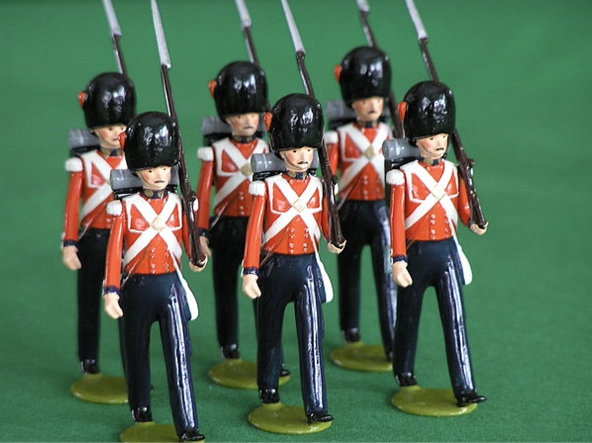 Replicas of Antique Nineteenth-Century Toy Soldiers, Wikipedia. When Charlotte, Branwell, Emily, and Anne Brontë were young, their father, Reverend Patrick Brontë, returned home from Leeds with twelve toy soldiers for Branwell, which served as the entry into their imaginary worlds of Angria and Gondol. The children grew immediately attached to the soldiers, aligning them with real-life figures they idolized (e.g., The Duke of Wellington and Napoleon) as well as making up entirely new characters (Anne's "Waiting Boy," who was constantly daydreaming and stuck in his head). The children imagined these soldiers to be from far flung reaches of the world or even from other worlds entirely. This imagination of other worlds was their first foray into what would eventually become the fantastical world of Angria, and the majestic city of Glass Town. Since these toy soldiers pictured represent the British Coldstream Guards during the Crimean War, they are a likely model to represent the actual toy soldiers that sparked the imaginations of the Brontës.