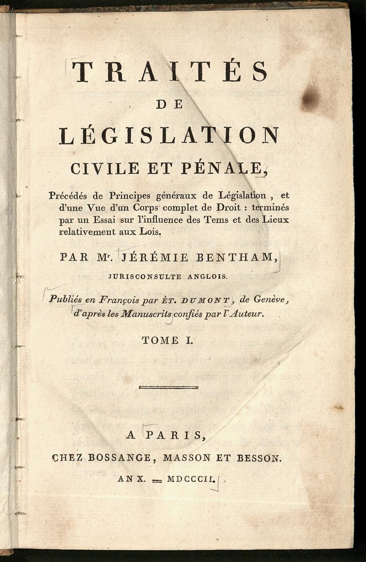 Bentham, Jeremy Bentham, Pierre Dumont, and tienne Louis. “Traites De Legislation Civile Et Penale, 3 Vols. 1802, First Edition by Jeremy Bentham, Pierre Dumont, Tienne Louis on The Lawbook Exchange, Ltd.” The Lawbook Exchange, Ltd. Accessed February 28, 2021. https://www.lawbookexchange.com/pages/books/69864/jeremy-bentham-pierre…;