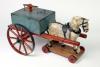 The toy pictured here, made in England in 1880, represents the toys available to wealthy children in the nineteenth century. The painted wooden Water Cart toy consists of two parts - the wooden horse on wheels and the attached wheel-cart. The wheels of the cart component are made of metal, and the addition of synthetic hair on the horse's mane provides texture.