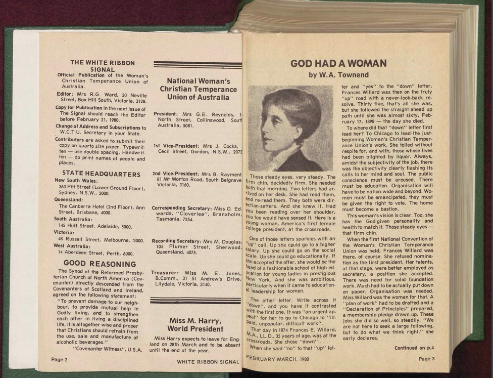Feb 1980 - Jan 1988. [The White Ribbon Signal, 1980-1988]. Pg (3-5). Melbourne. Woman’s Christian Temperance Union of Victoria. Gender: Identity and Social ChangeAvailable through: Adam Matthew, Marlborough, Gender: Identity and Social Change, http://www.genderidentityandsocialchange.amdigital.co.uk.proxy-remote.g… [Accessed November 24, 2020].