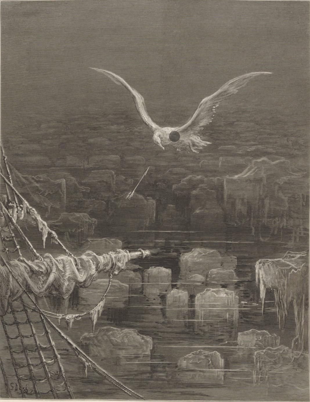 I am pretty sure this photo was drawn by Gustave Dore. I think this is one of the best looking photos of the scene where the albatross is killed and it not only shows the beautiful oceanic scene, but also the symbolism and tension in this scene. I think it is fascinating that he decided to draw it right before the albatross is killed which slows down this scene and leaves the audience to reflect on all of the elements that are included in this part.