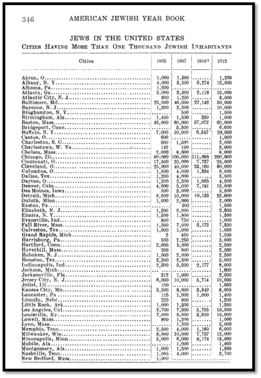 This Image shows the Immense amount of Jewish in the Yearbook across the US. This picture also includes Harrisburg PA dating from 1905 to 1912. It only shows cities with more than 1,000 Jewish Immigrants residing in each of them.
