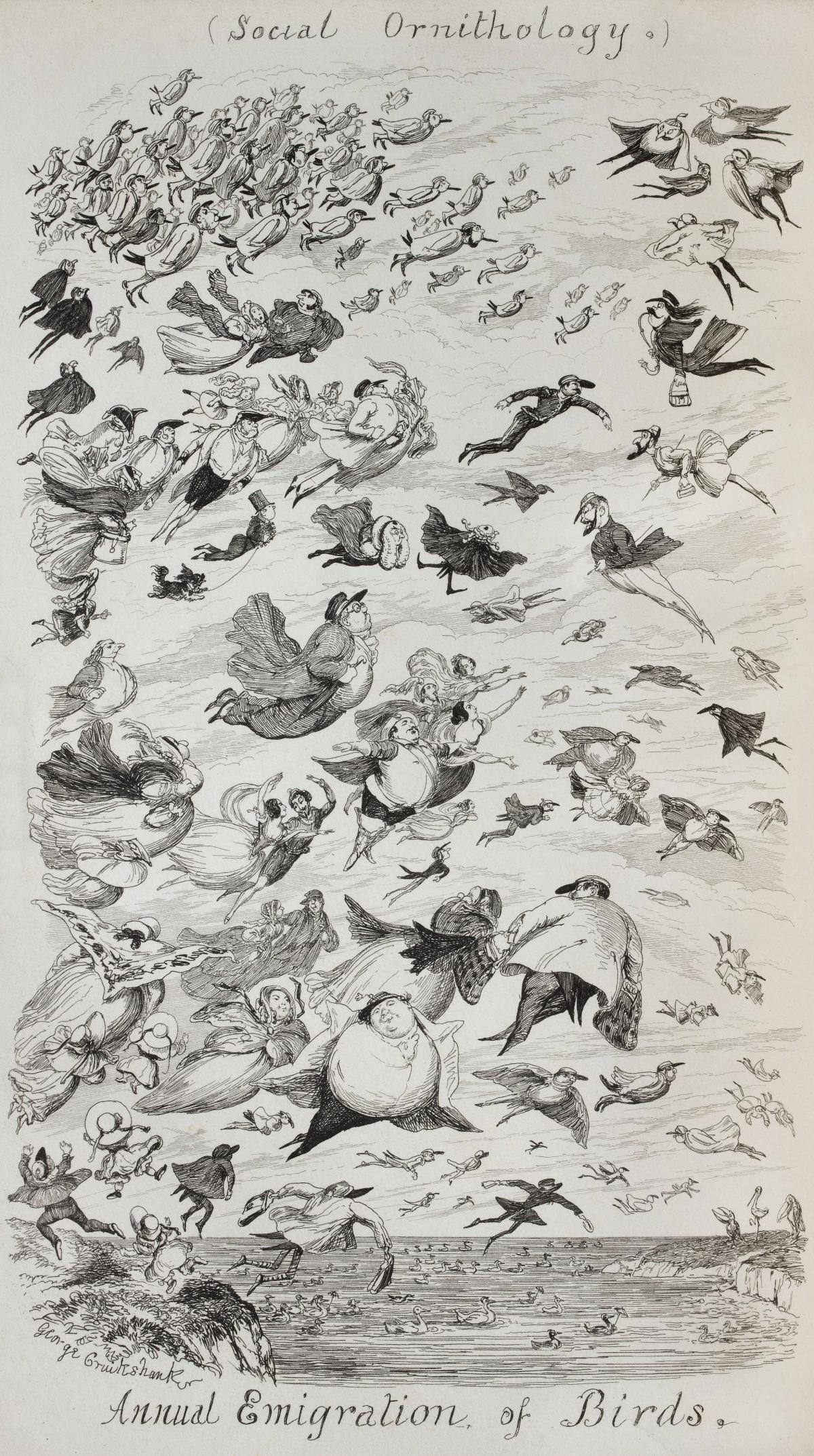 George Cruikshank, "Social Ornithology: The Annual Emigration of Birds," from George Cruikshank's Table-Book, 1845, The Norman M. Fox Collection, Skidmore College. In this first plate, Cruikshank--a caricaturist known to satirize both sides of an issue--turns to ornithology to make a comment on Victorian life. The migrating birds are wearing hats that designate their social classes--the privileged in top hats and the masses in common caps. Some depicted are birds of prey called lawyer vultures in the accompanying chapter called "Social Zoology--Ornithology"; next on the social ladder are the hawks or bailiffs, who feed upon the prey of the vultures, most commonly the "Social Booby, [who] walks with difficulty, and cannot get on" (166). Does Cruikshank pity the poor booby, a term that even today means a stupid person?