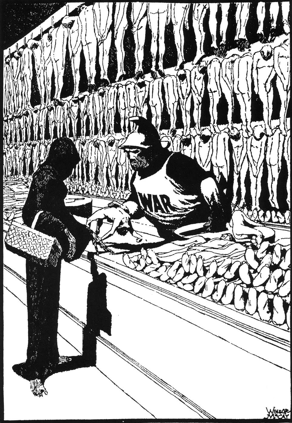This image, published towards the end of the First World War, depicts a cloaked figure (a physical representation of Death) being given a body by a man wearing a shirt that reads, "War". War stands at the counter, a wall of bodies behind him. Windsor McCay's, the illustrator of this cartoon, is personifying the constant fall of Man as a result of war. Although Death is the one receiving bodies from War--implying that He is the customer--War is also Death's greatest customer, as the act of war produces a significant amount of casualties, on and off the battlefield.