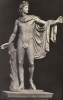 The Apollo Belvedere, a 2nd century CE Roman copy of a 4th century BCE Greek bronze, is so named because of its one-time home in the small Bramante-designed sculpture court (Cortile del Belvedere) of the summer residence connected to the Vatican Palace. Having been transported to Paris amongst the trove of artworks confiscated by Napoleon as part of his 1796 campaign in Italy, it formed part of the Louvre’s collection until 1815 when it was repatriated to the Vatican, and where it has remained in the Museo Pio-Clementino since. As “the highest ideal of art among the works of antiquity that have escaped its destruction” (Winckelmann 332) —according to 18th century German art historian and archaeologist, J. J. Winckelmann—the Apollo Belvedere has been a favorite subject of study and object of emulation among artists over multiple centuries: northern Renaissance German painter Albrecht Dürer reversed the pose for his figure of Adam in his 1504 Adam and Eve; neoclassical Italian sculptor Antonio Canova drew inspiration from its "noble simplicity and quiet grandeur”—a phrase Winckelmann was known to liberally apply to any and all ancient works for which he had a particular fondness—for his 1801 Perseus. Despite ocassional criticism of the Apollo (noted late 18th/early 19th-century English essayist William Hazlitt called it “positively bad,” and noted Victorian art critic John Ruskin offers a less than flattering assessment of it), full-length plaster and bronze reproductions of the sculpture remained central to the cast collections of both individual art connoisseurs, as well as academic institutions. Less expensive, but equally impressive interpretive sketches, etchings, and paintings of the sculpture were still among the most popular souvenirs of wealthy 19th-century Grand Tour travelers.