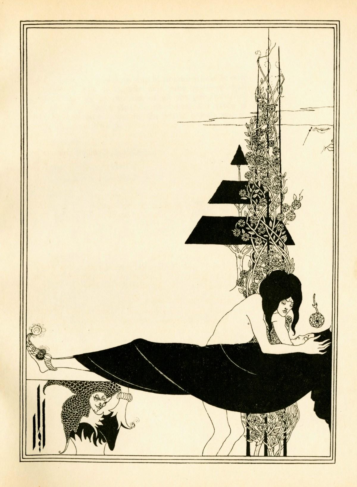 This black-and-white wood-block print by Aubrey Beardsley depicts the Page of Herodias mourning the death of the Syrian Captain. "Platonic," in its title, refers to the Greek philosopher Plato. Stylistically, it is in accord with the other illustrations Beardsely produced for Salome, exhibiting the aesthetics of the Art Nouveau and Aestheticist movements of which he was a part. It is highly geometric, most obviously in the depiction of the tree in the midground. It makes use of negative space - the entire upper-left quadrant of the piece is left empty. Both the Page of Herodias and the Syrian Captain are depcited in a remarkably androgynous - perhaps even feminine - manner, possibly suggesting homosexual undertones. It is the second and only other illustration in Salome to include the moon, an important recurring motif in the play. The ambiguous expression with which the face-in-the-moon is depicted in this illustration could perhaps simply signify the Syrian Captain's death (the face's eyes are closed and is largely inanimate), or maybe the Page's anguish and grief (either cordially or romantically, depending on how much one wants to read into the homosexual undertones).