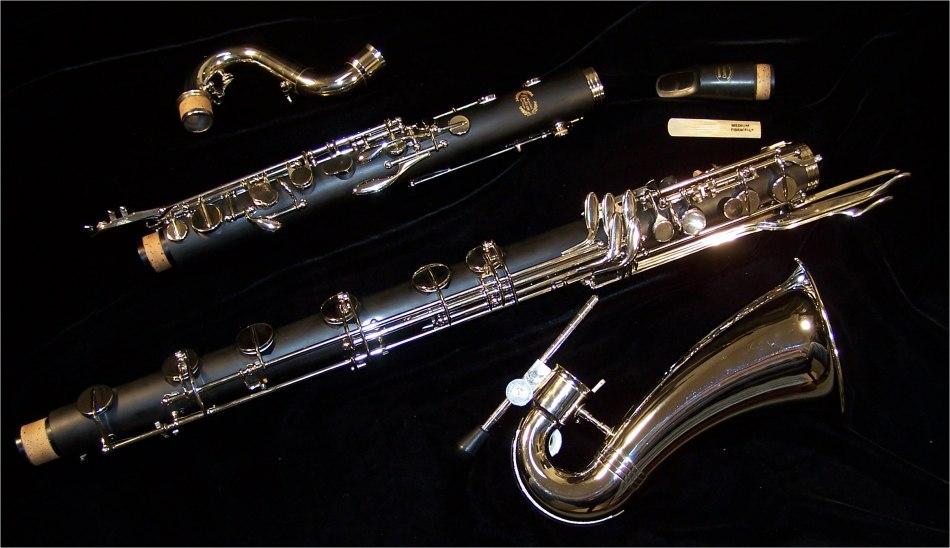 The standard bass clarinet consists of six main parts: the mouthpiece (with reed and ligature), crook/neck, upper and lower joints, bell and peg. Because of its size, the bass clarinet rests on the floor directly in front of the musician.